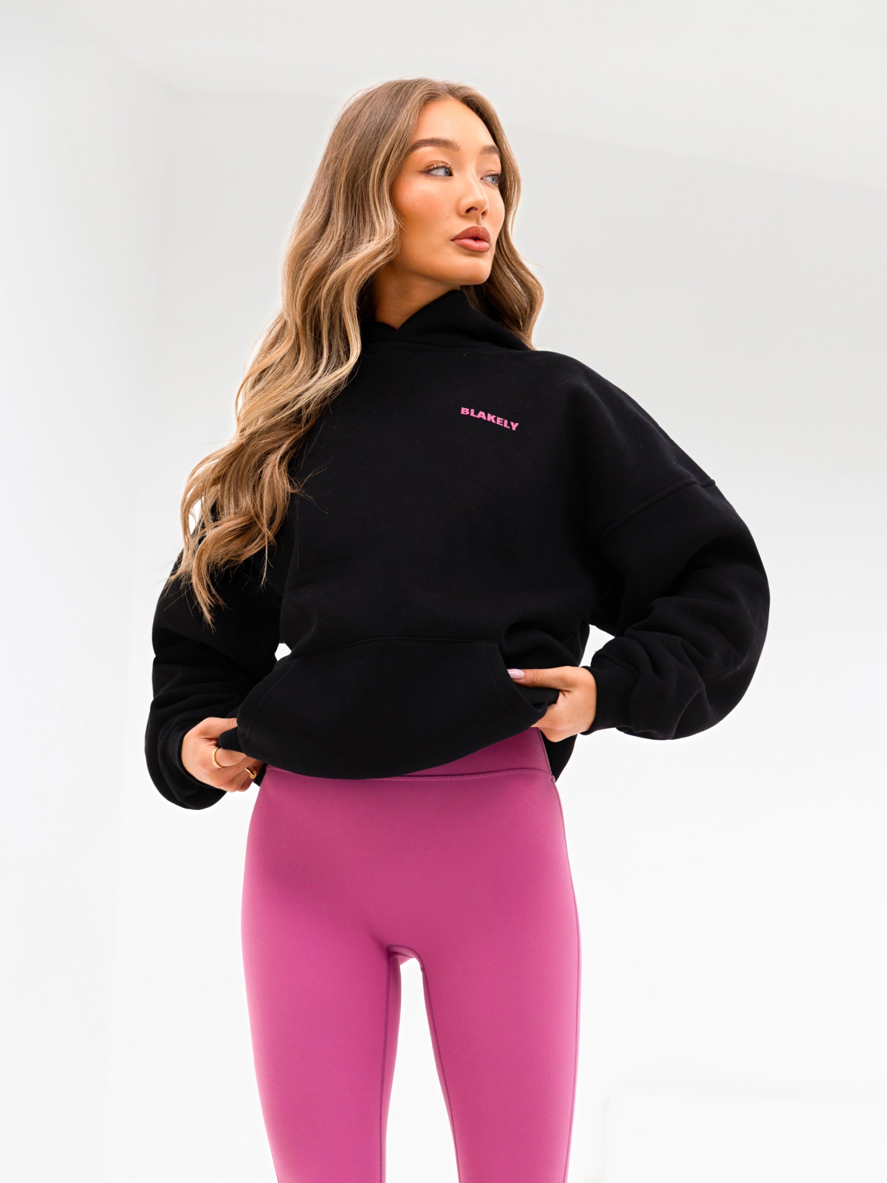 Our Amelie Hoodie features an oversized fit and a roomy front pocket. making it perfect for everyday activities and lounging. It also showcases our Blakely branding in bold on the back. which complements the rest of the collection.