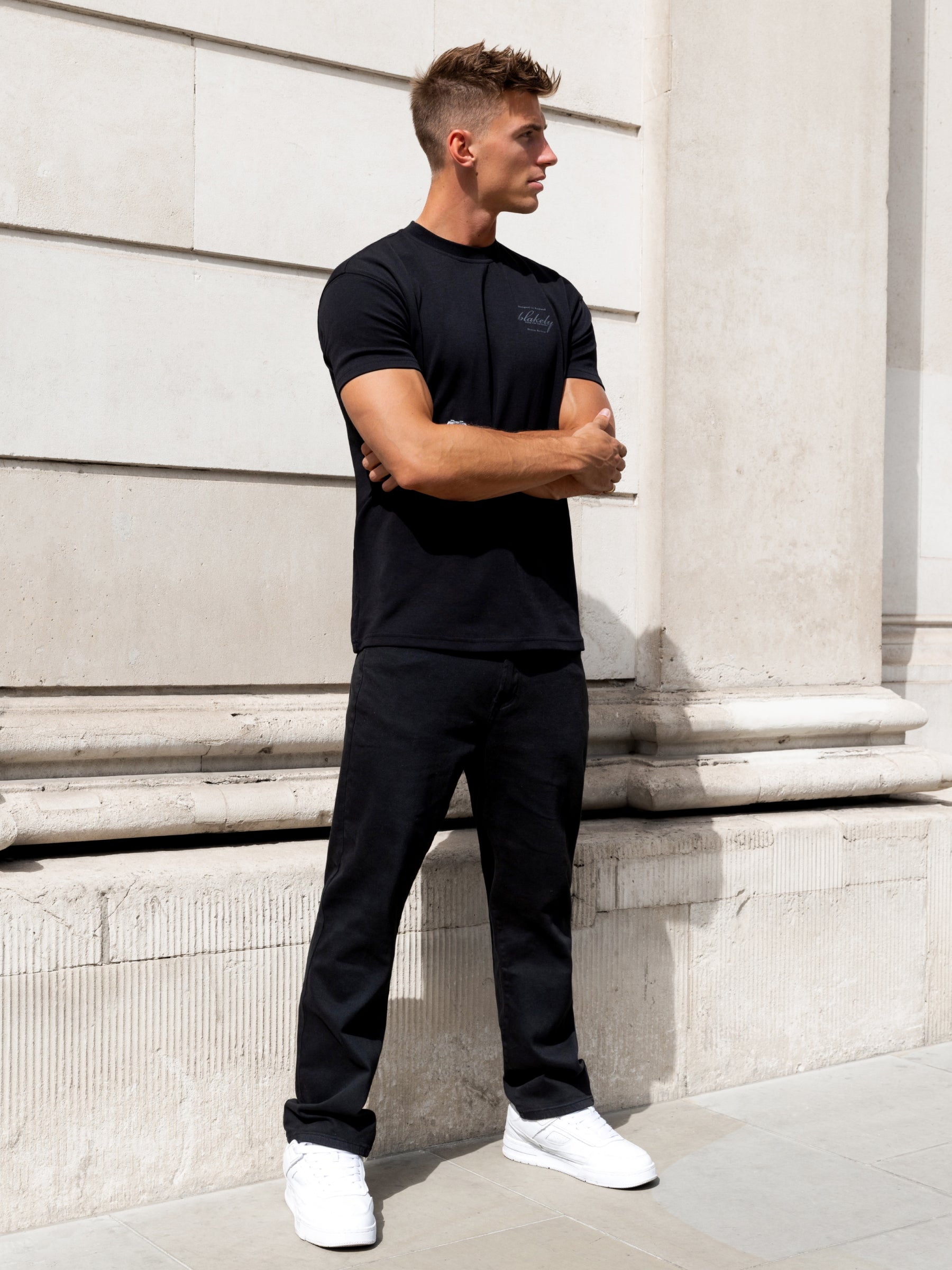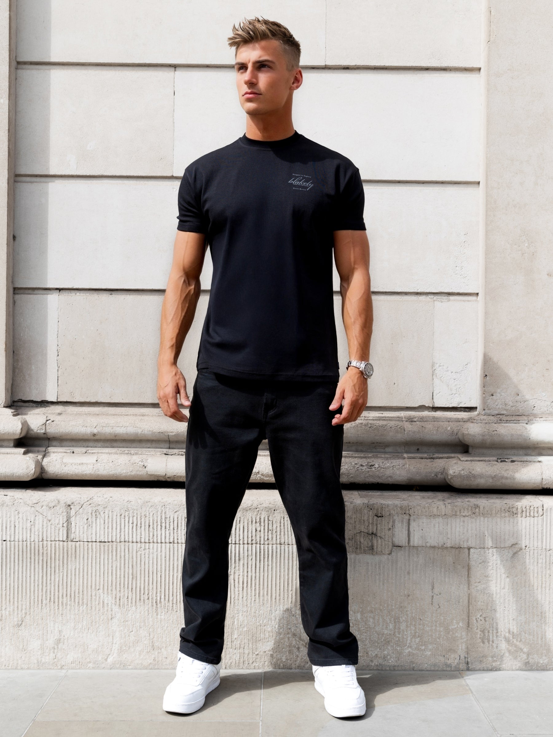 Introducing our Austin Script T-Shirt in Black. crafted from a soft cotton blend and designed with a relaxed fit for comfort. This T-Shirt features a small Blakely logo in a script font on the front.