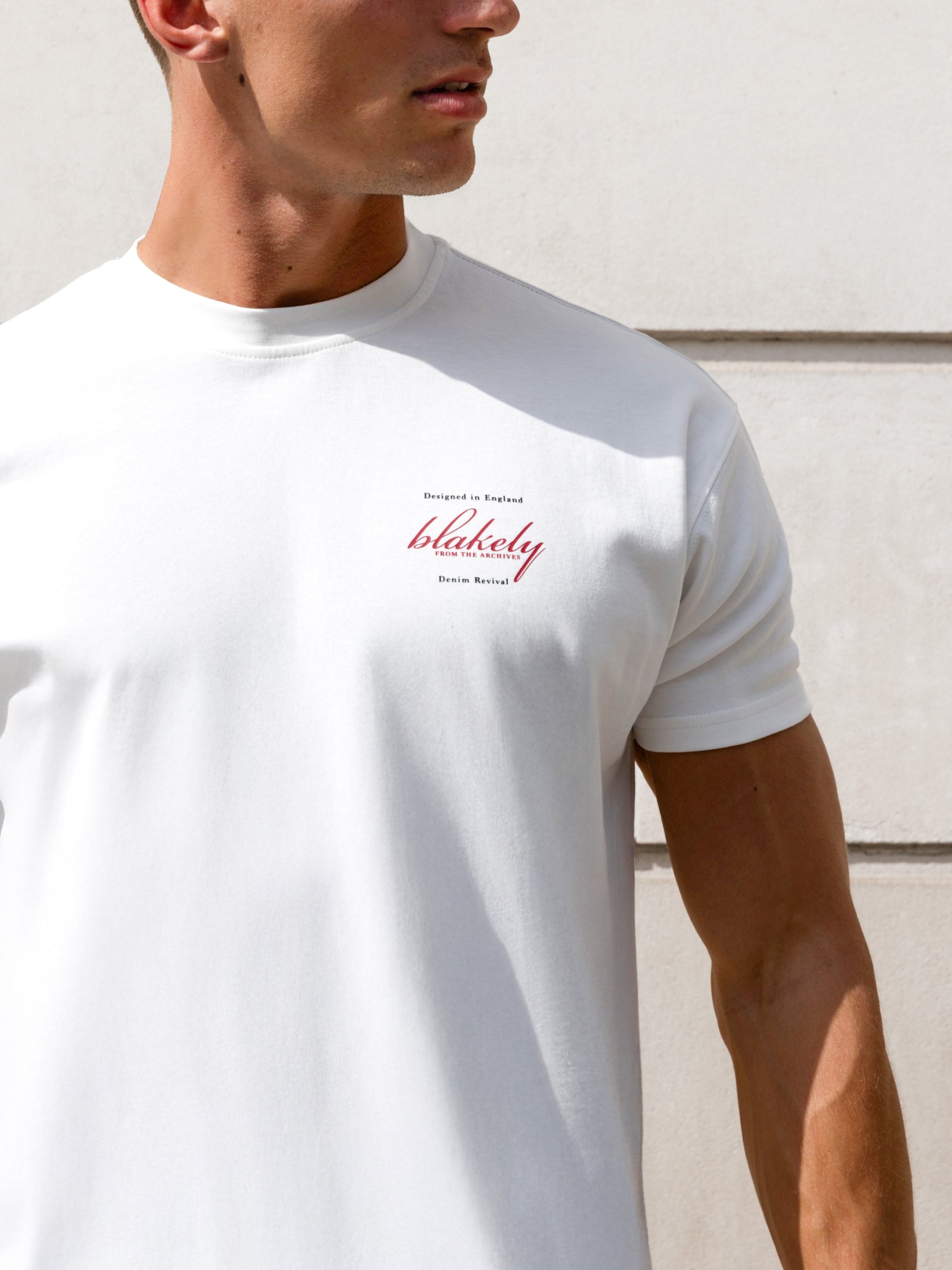 Introducing our Austin Script T-Shirt in Flat White. crafted from a soft cotton blend and designed with a relaxed fit for comfort. This T-Shirt features a small Blakely logo in a script font on the front.