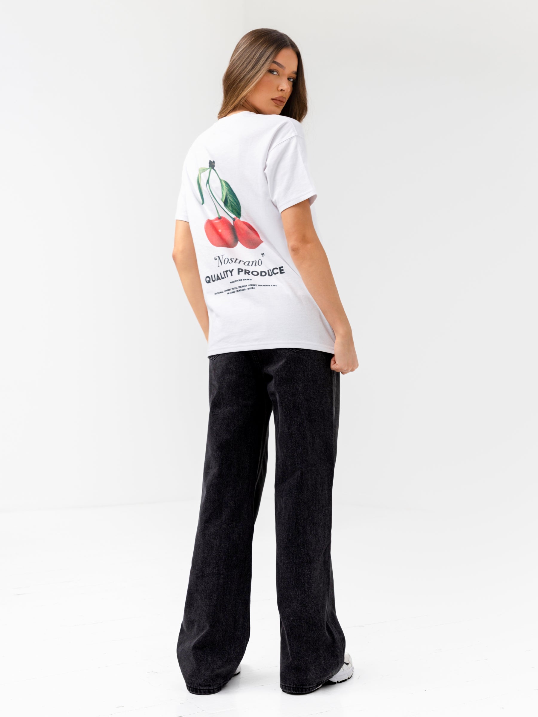 Introducing our Callie Fruit Tee in White. crafted from a soft cotton blend and designed with an oversized fit for ultimate comfort. This T-shirt features a bold screen-printed fruit graphic on the back and a minimal logo on the front.