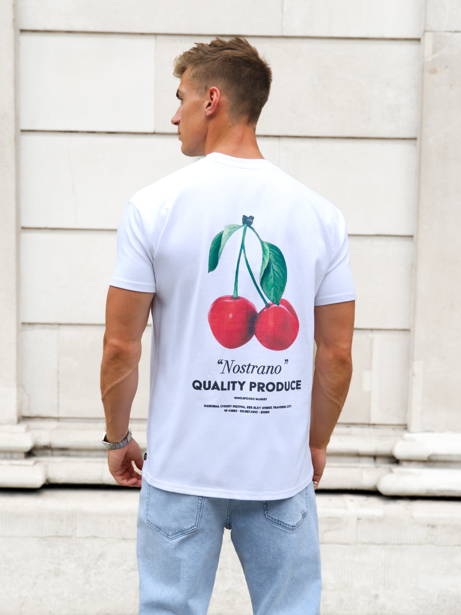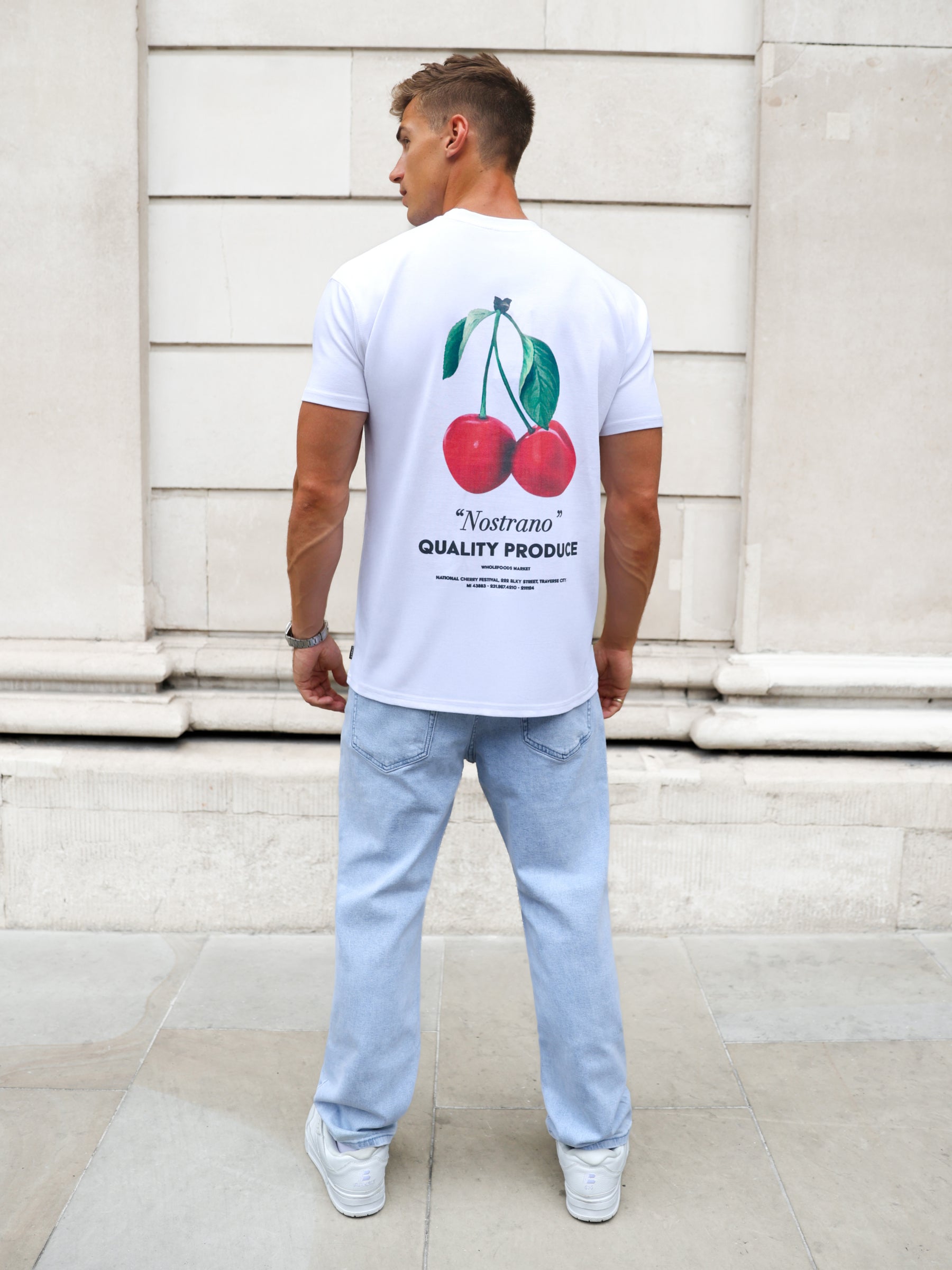Introducing our Cherry Print Tee in White. crafted from a soft cotton blend and designed with a relaxed fit for ultimate comfort. This T-shirt features a bold screen-printed fruit graphic on the back and a minimal logo on the front.