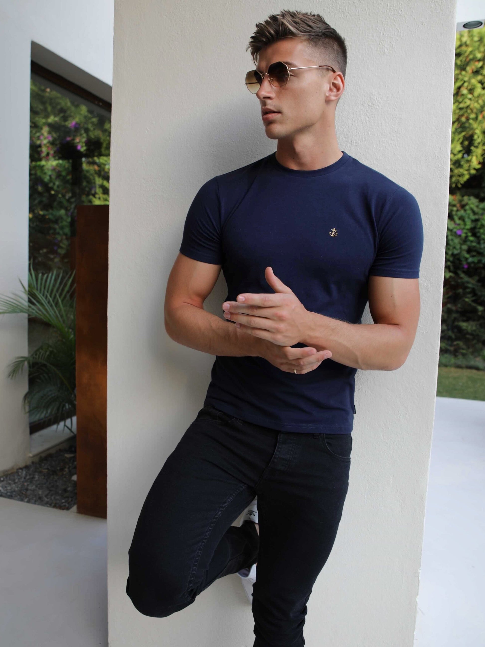 Introducing the Conway T-Shirt in navy. a slim-fit t-shirt made from a soft cotton blend. It has short sleeves. a crewneck collar. and is finished with gold Anchor branding on the chest.