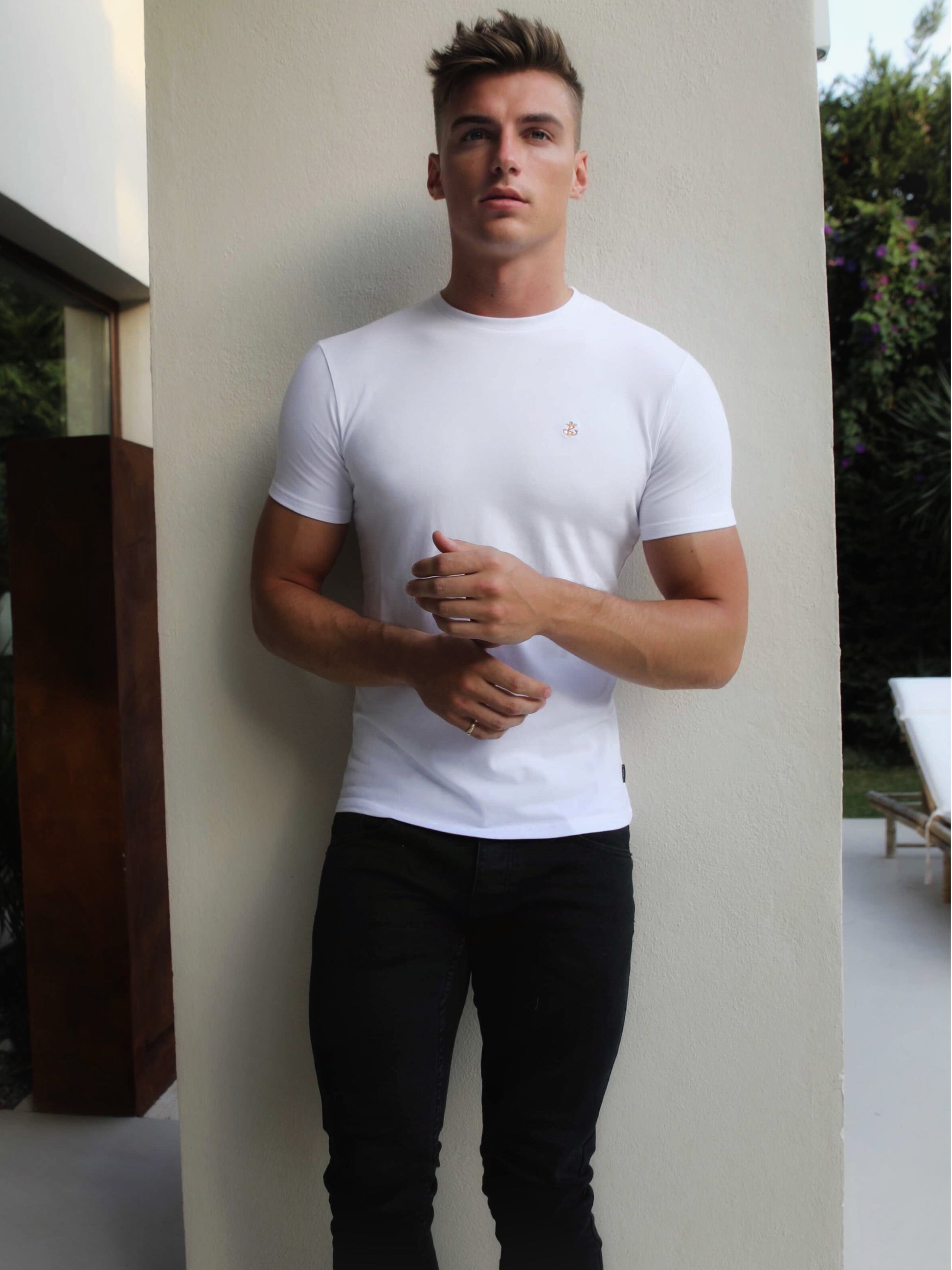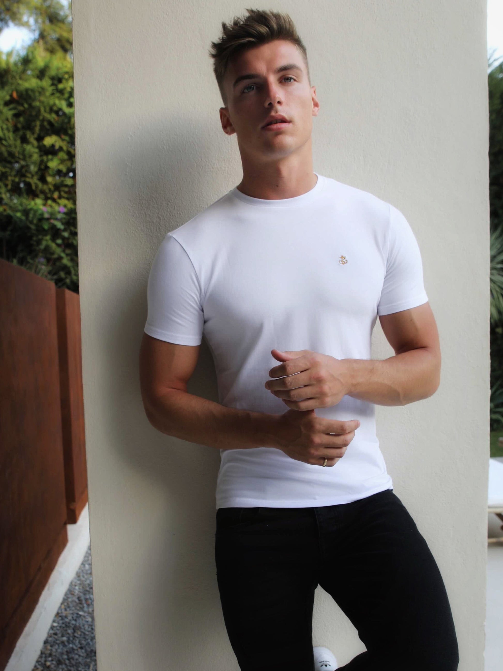 Introducing the Conway T-Shirt in white. a slim-fit t-shirt made from a soft cotton blend. It has short sleeves. a crewneck collar. and is finished with gold Anchor branding on the chest.