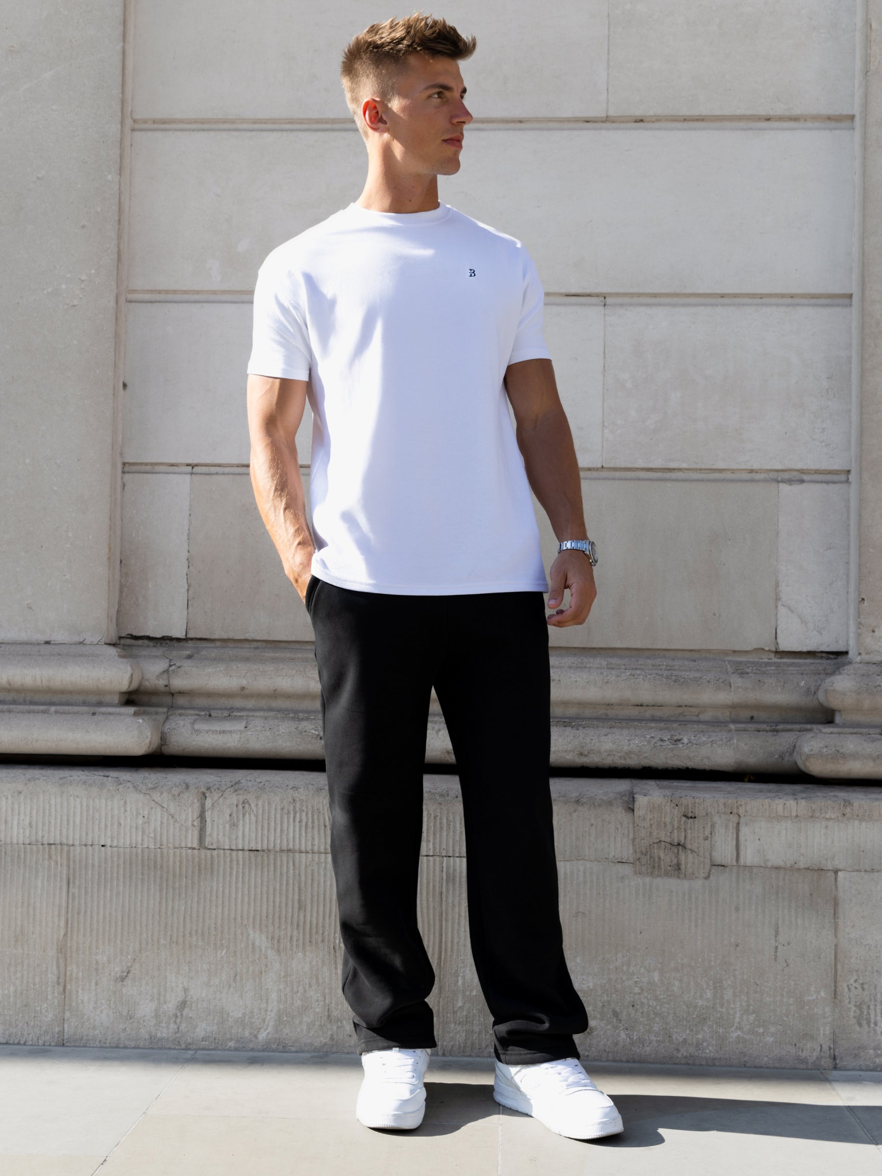 The Declan Sweatpants in Black are crafted from a soft cotton blend. offering a relaxed fit and an elasticated drawstring waist for a customizable. baggy fit. They have a wide leg and side pockets for added convenience. The sweatpants are finished with a bold Blakely logo.