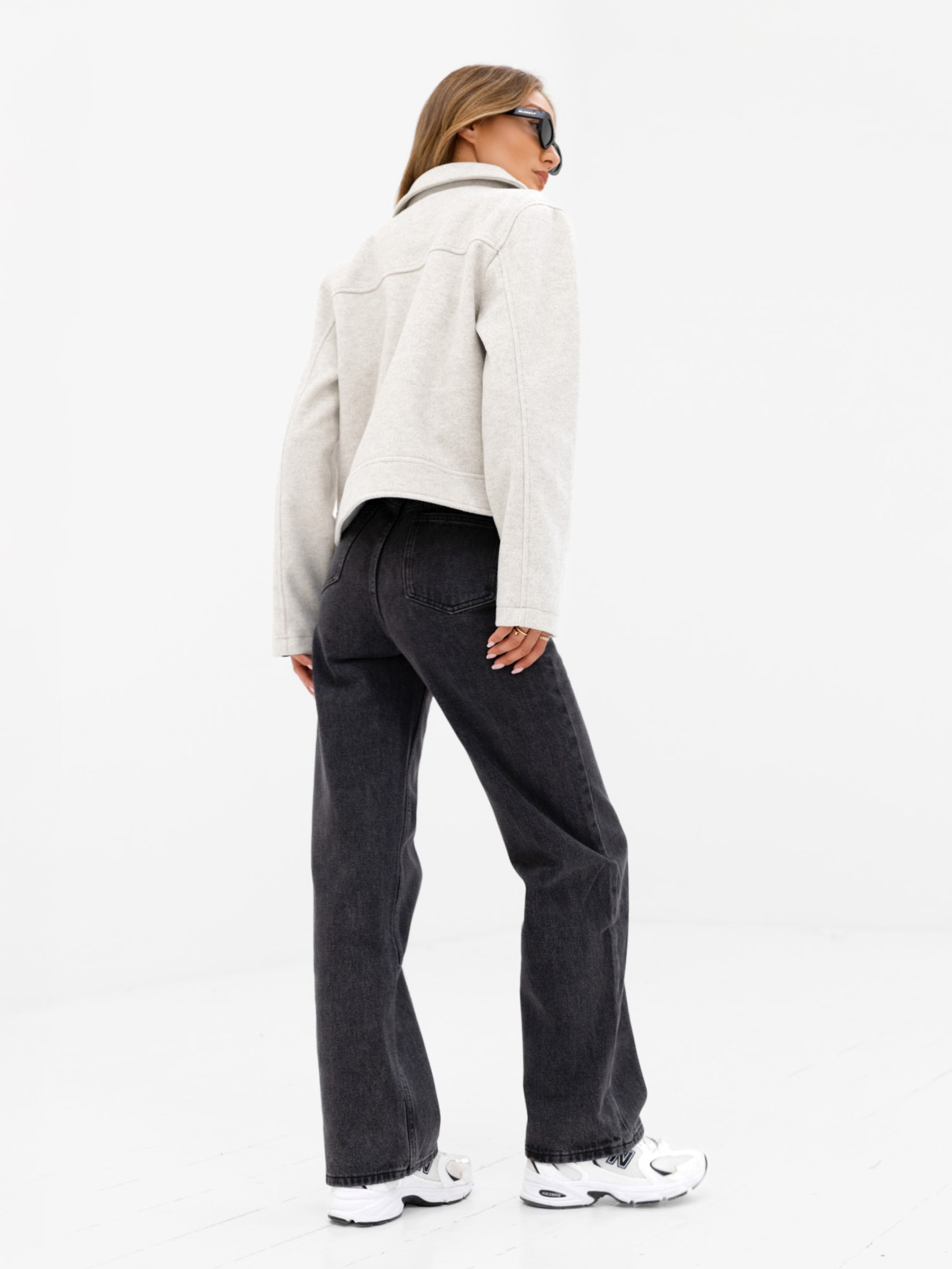 The Ellie Jacket is crafted from soft felt fabric and lined for a structured fit. Designed with a full gun metal zip. double breast pocket front and a subtle cuff tab logo detail. A perfect outer layer made to elevate everyday dressing.