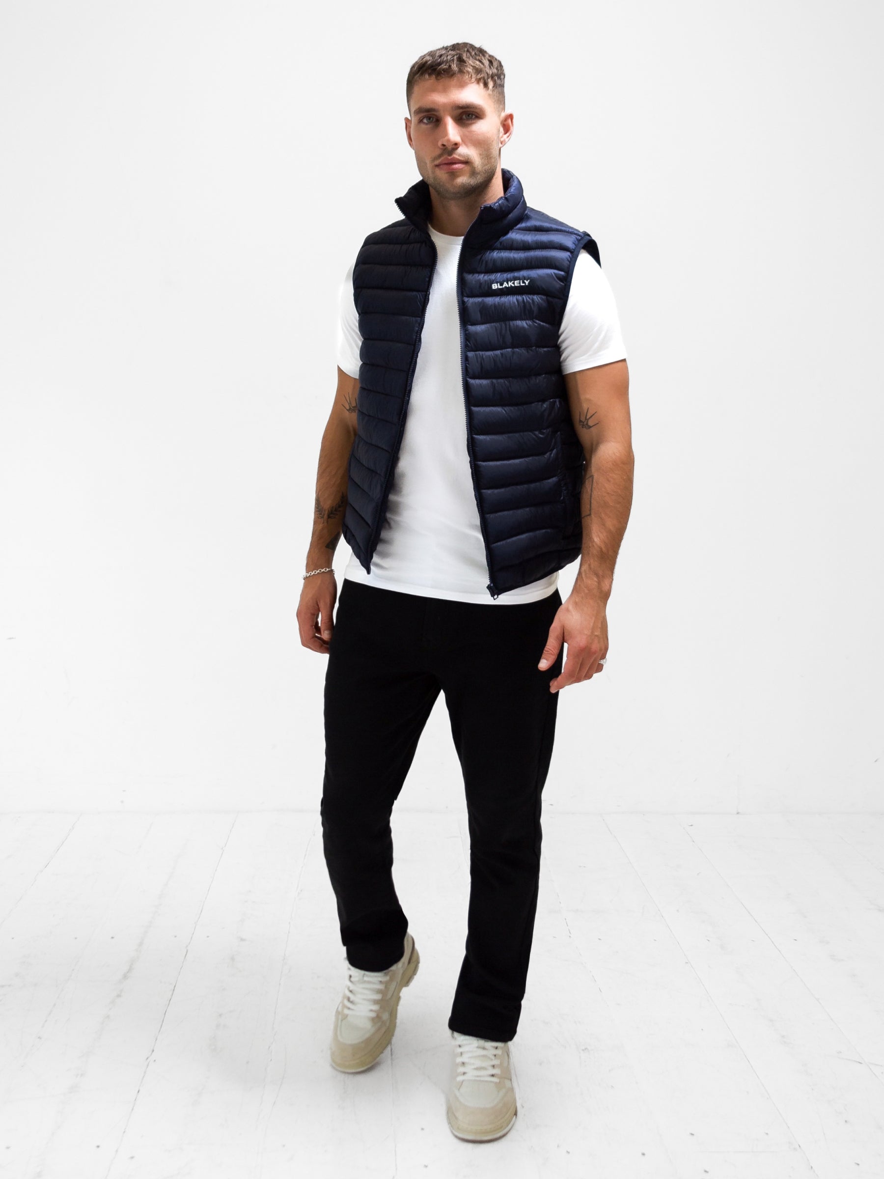 Our Ellis lightweight gilet in navy. is a sleeveless vest that provides warmth without adding bulk. It is made from breathable. shower-resistant materials. making it perfect for layering and offering comfort and mobility in cooler weather. The gilet has been finished with our Blakely branding on the chest.