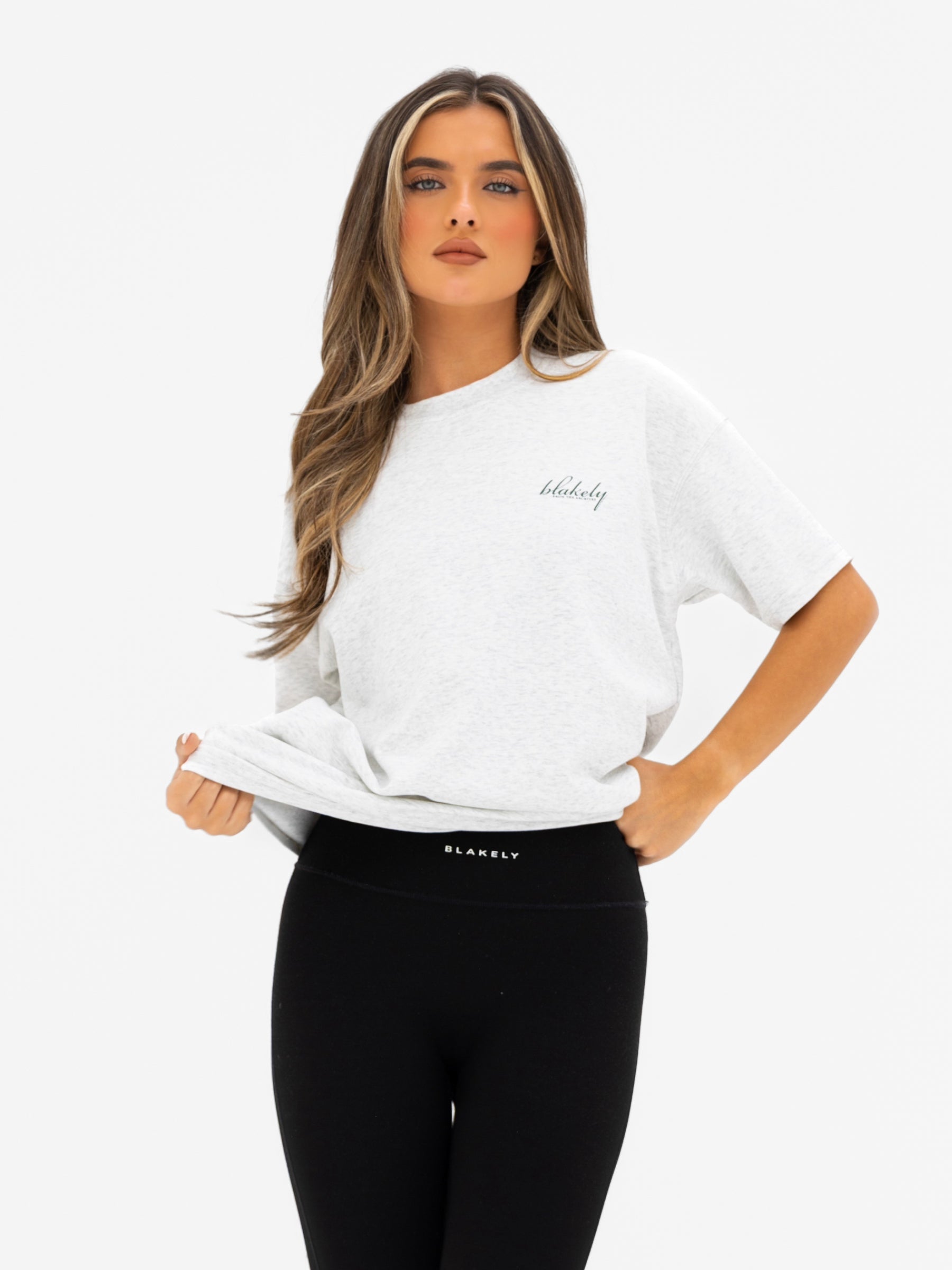 Introducing our Georgia T-Shirt in Marl Grey. crafted from a soft cotton blend and designed with a relaxed fit for comfort. This T-Shirt features a small Blakely logo in a script font on the front.