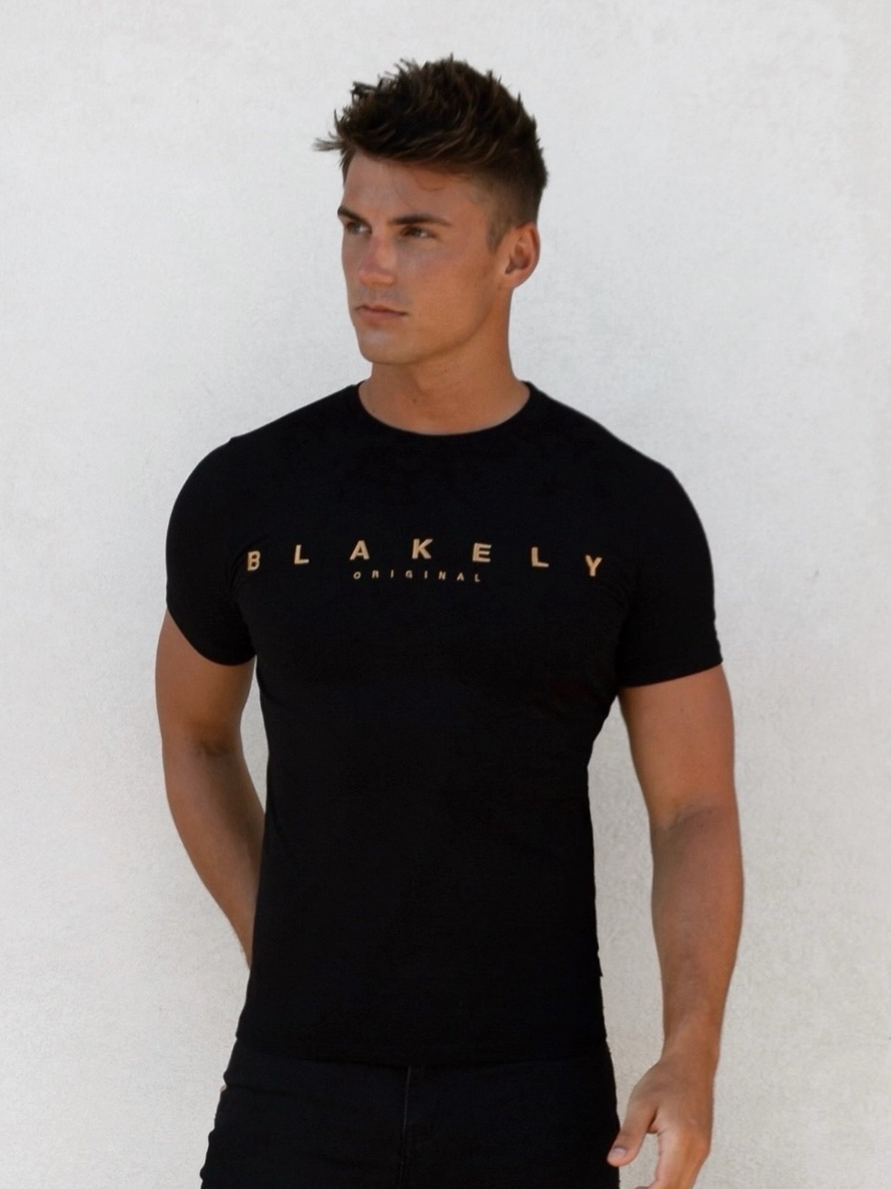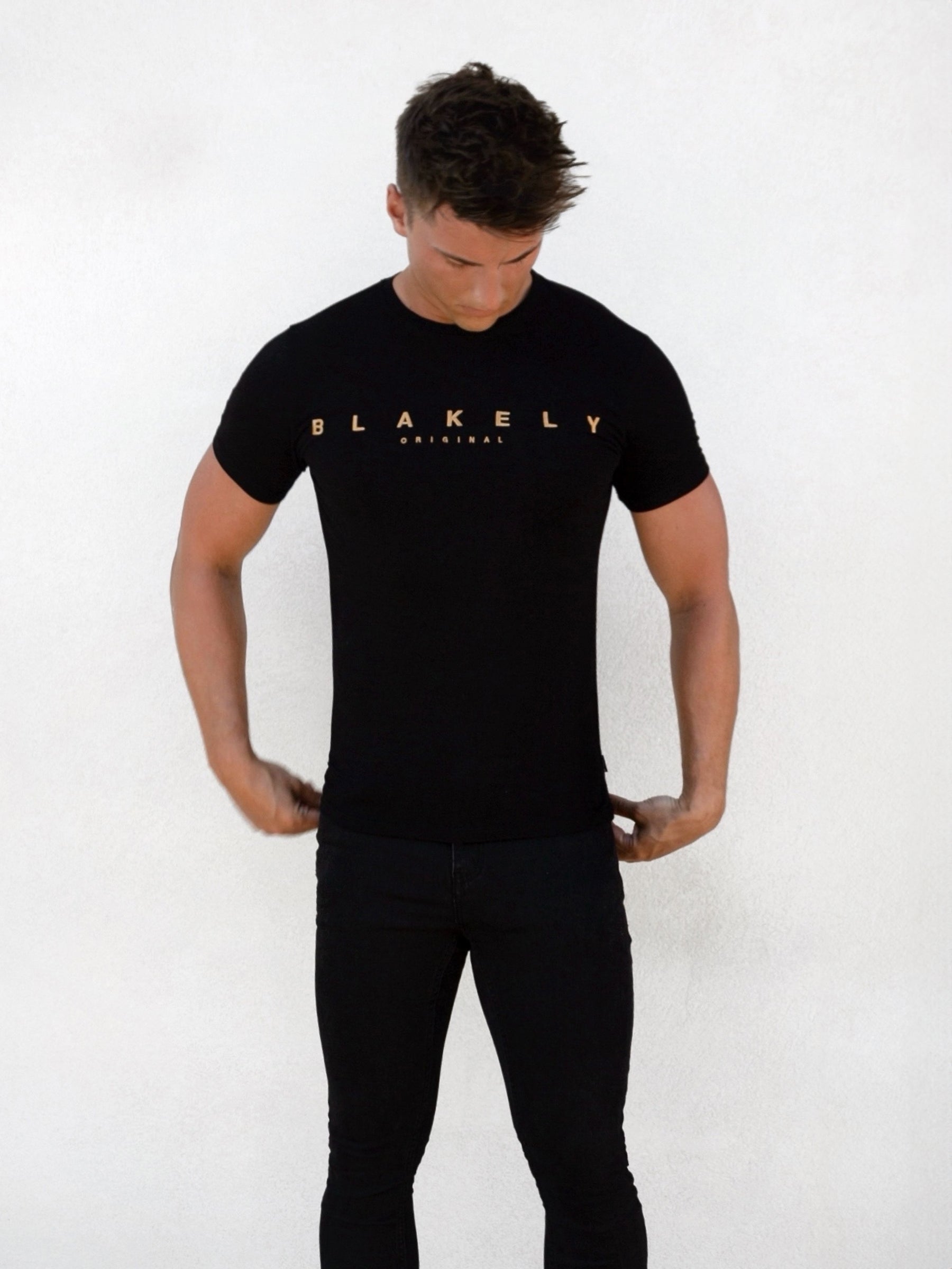 Introducing the Goldcross T-Shirt in black. a slim-fit t-shirt made from a soft cotton blend. It has short sleeves. a crewneck collar. and is finished with Blakely branding in gold on the centre front.