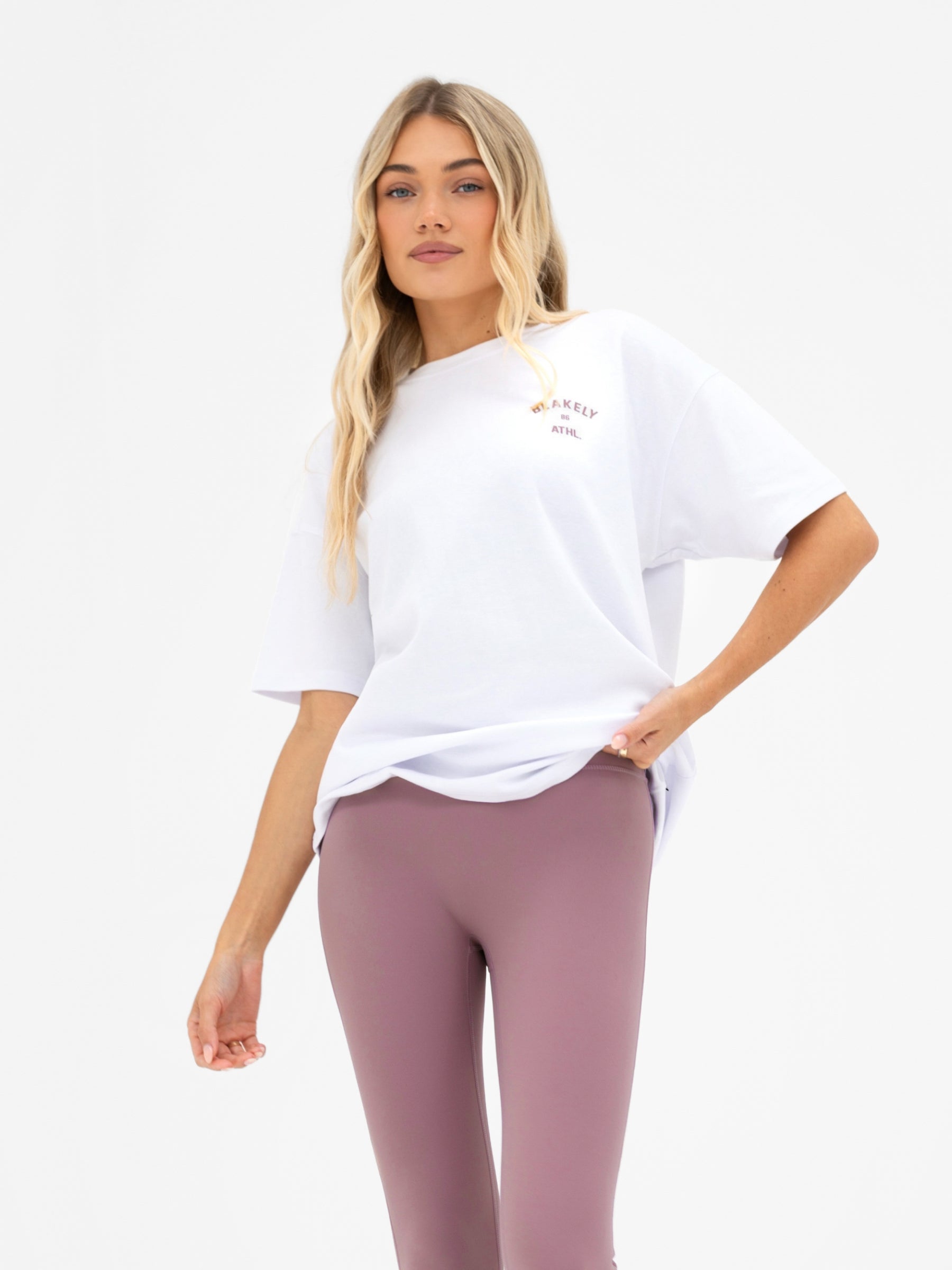 Introducing our Hallie T-Shirt in White & Dusty Pink. crafted from a soft cotton blend and designed with an oversized fit for ultimate comfort. This T-Shirt features a bold arched screen-printed logo to the back. and smaller branding to the front.