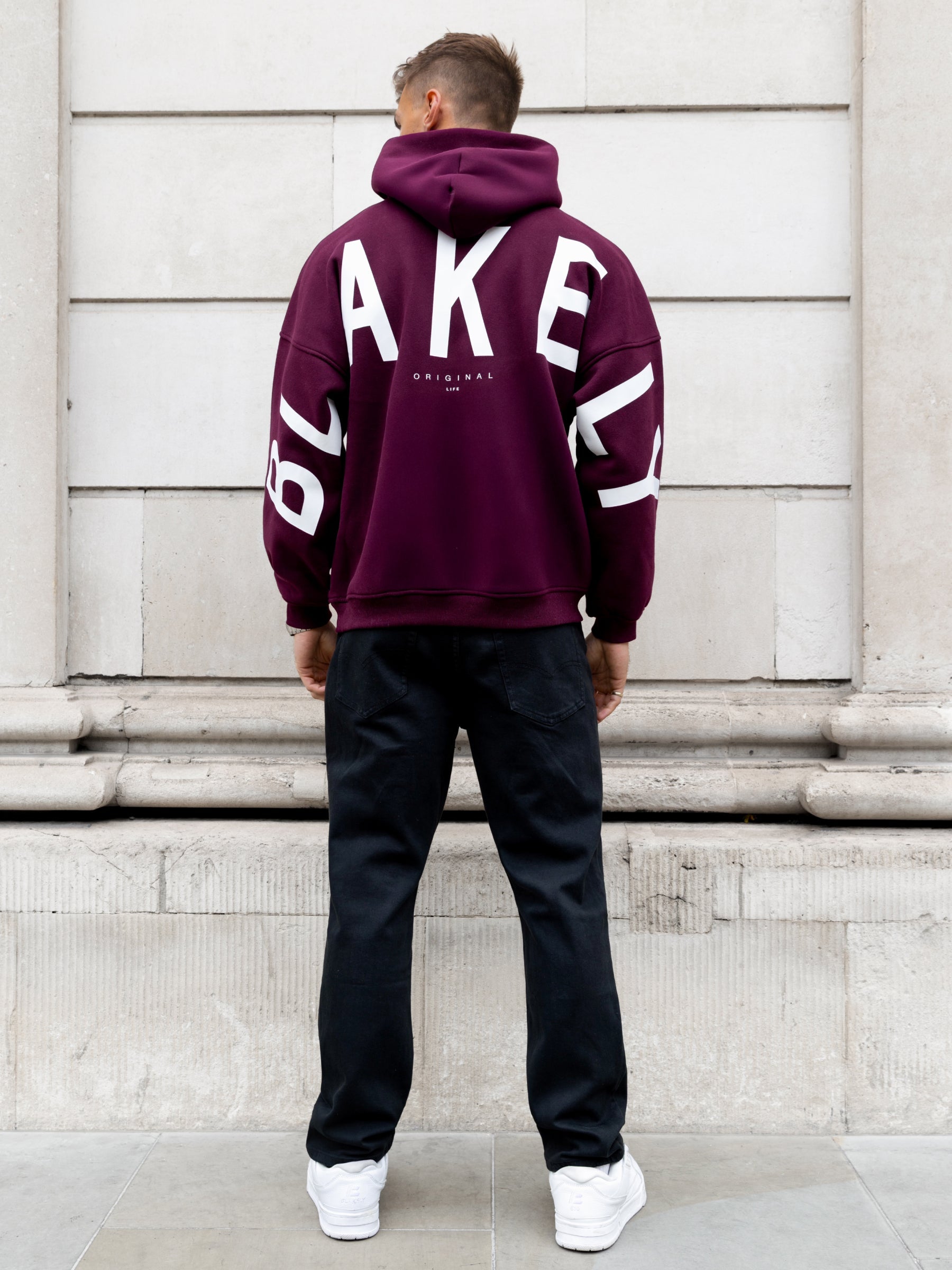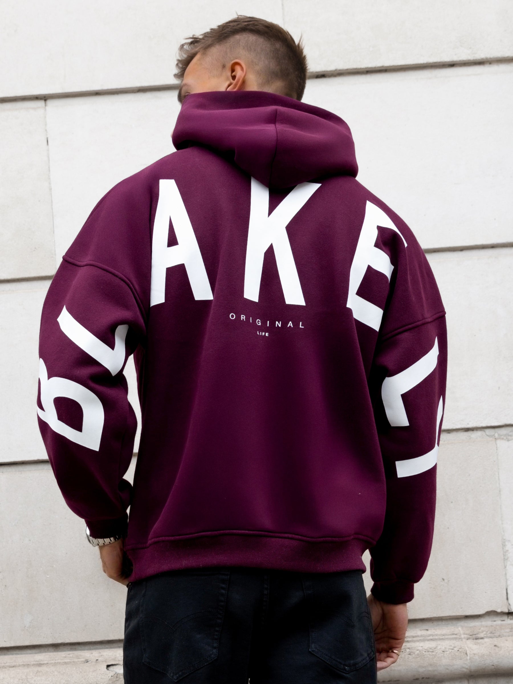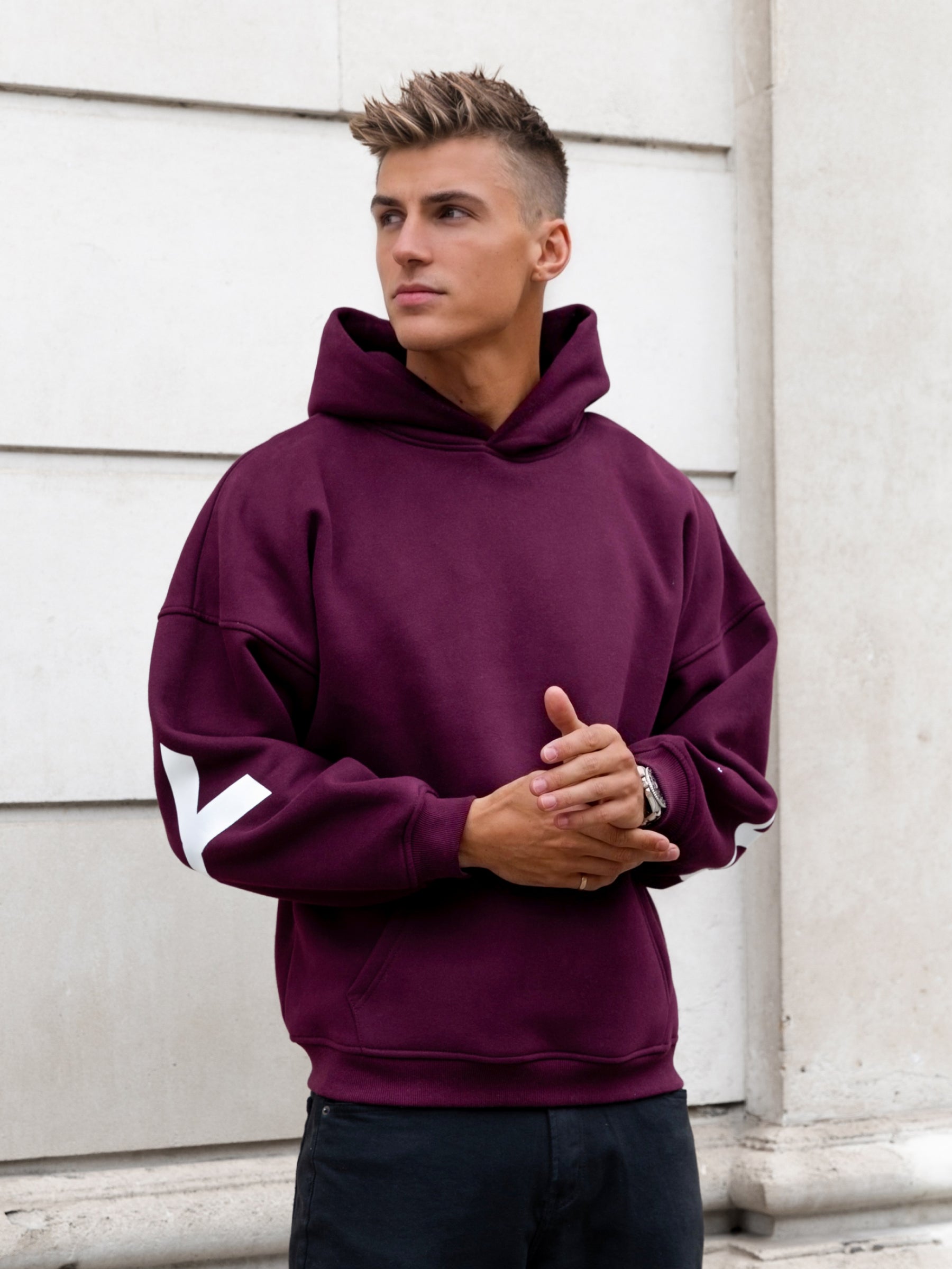 Introducing our best-selling Idris Hoodie in Burgundy. our flagship product. Made from a soft cotton blend with an oversized fit. the hoodie features a ribbed hem and cuffs. as well as a large front pocket. It showcases our logo screen-printed across the back and arms. offering a clean and bold representation of our brand.