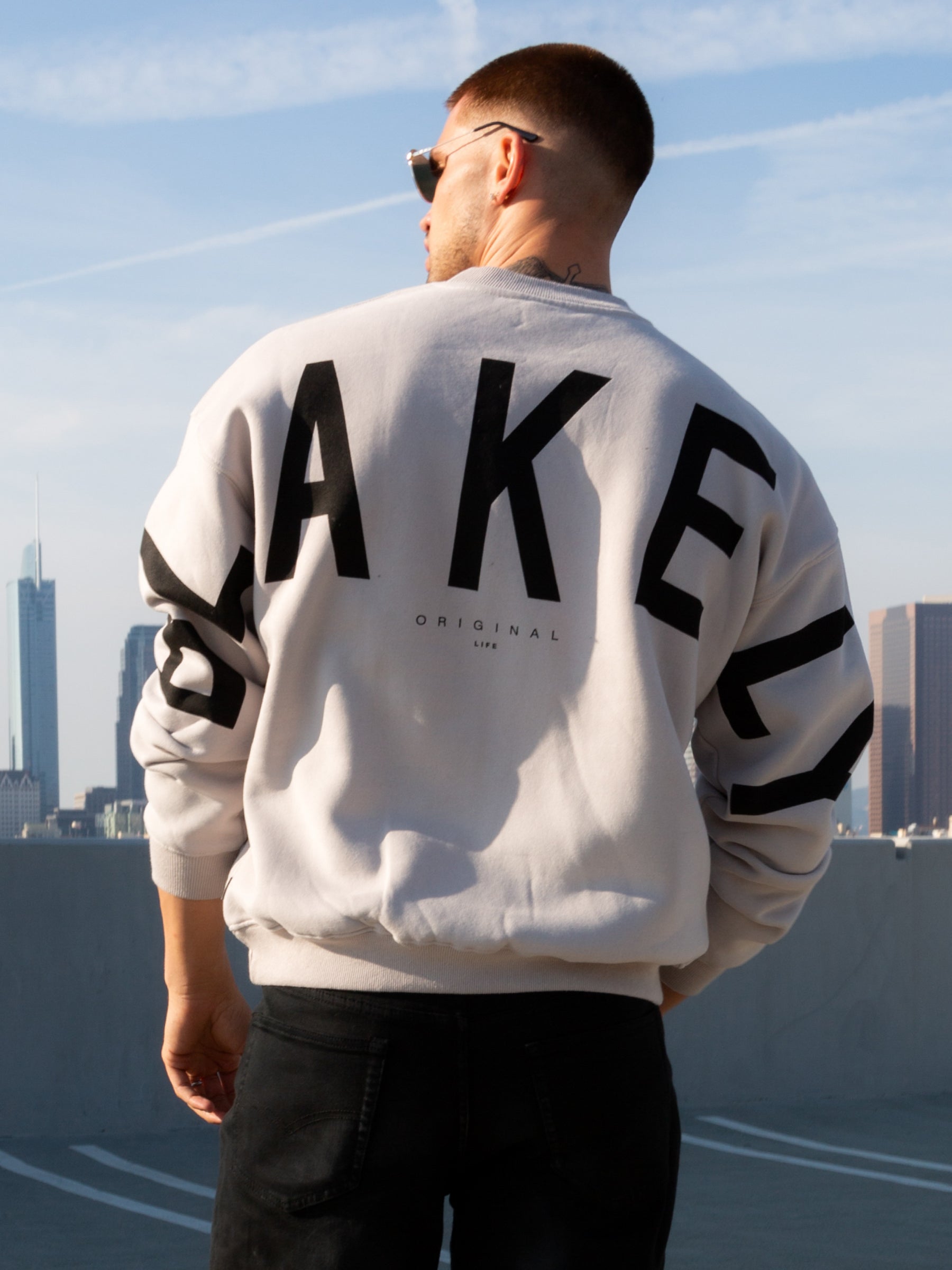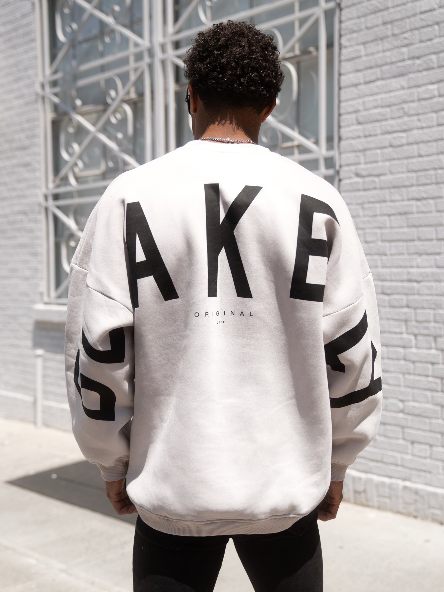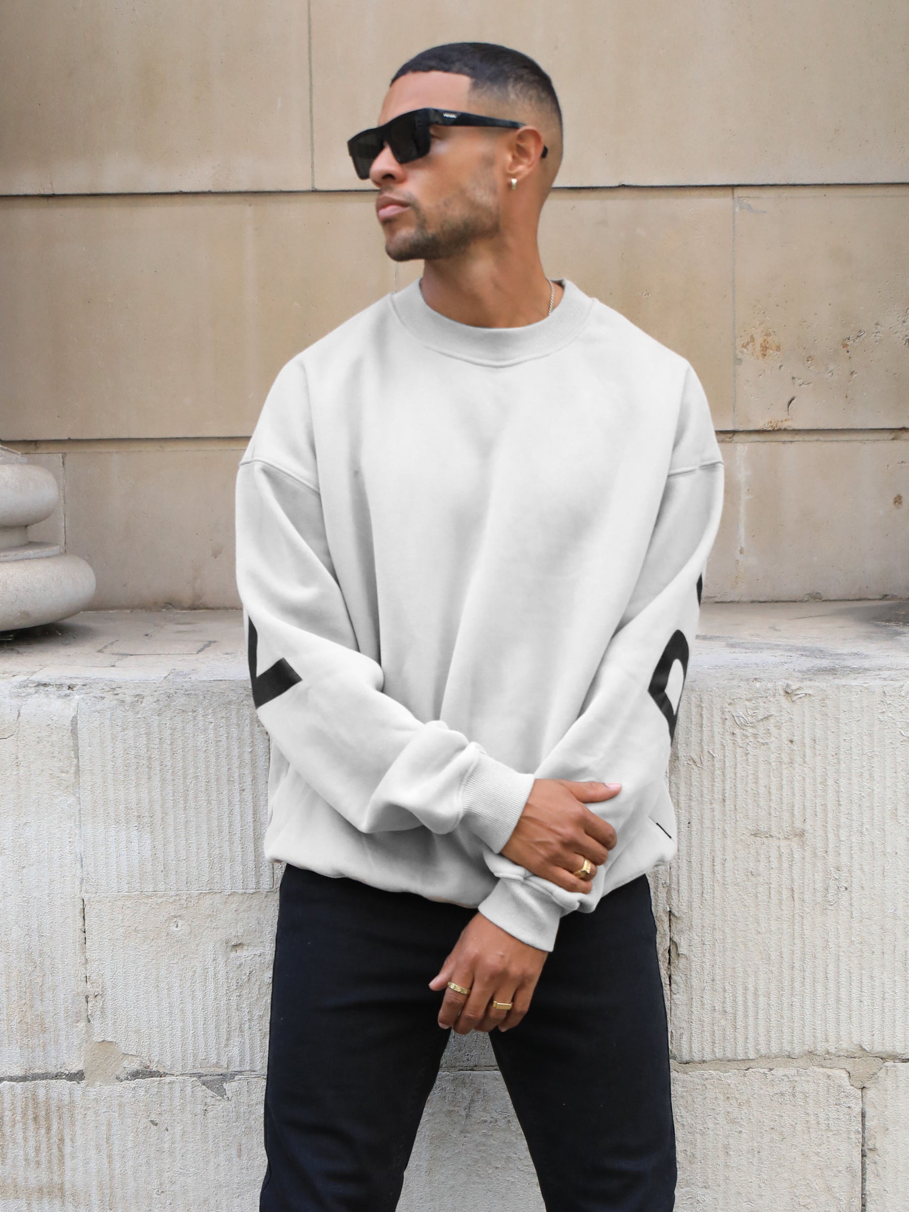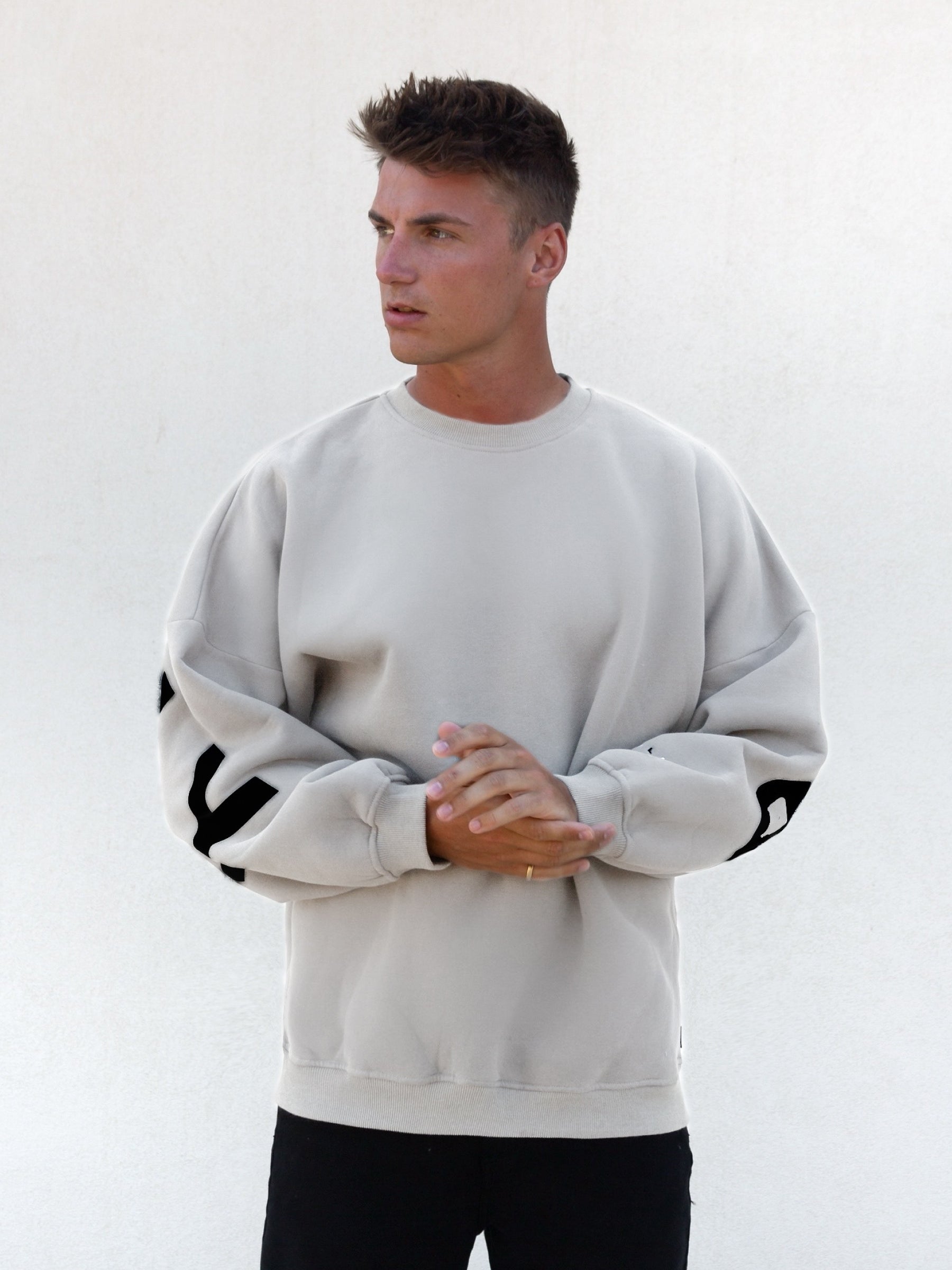 Introducing our best-selling Idris Sweater in stone. our core product. Made from a soft cotton blend with an oversized fit. the sweater features a ribbed hem and cuffs. as well as a crew neck design. It showcases our logo screen-printed across the back and arms. offering a clean and bold representation of our brand.