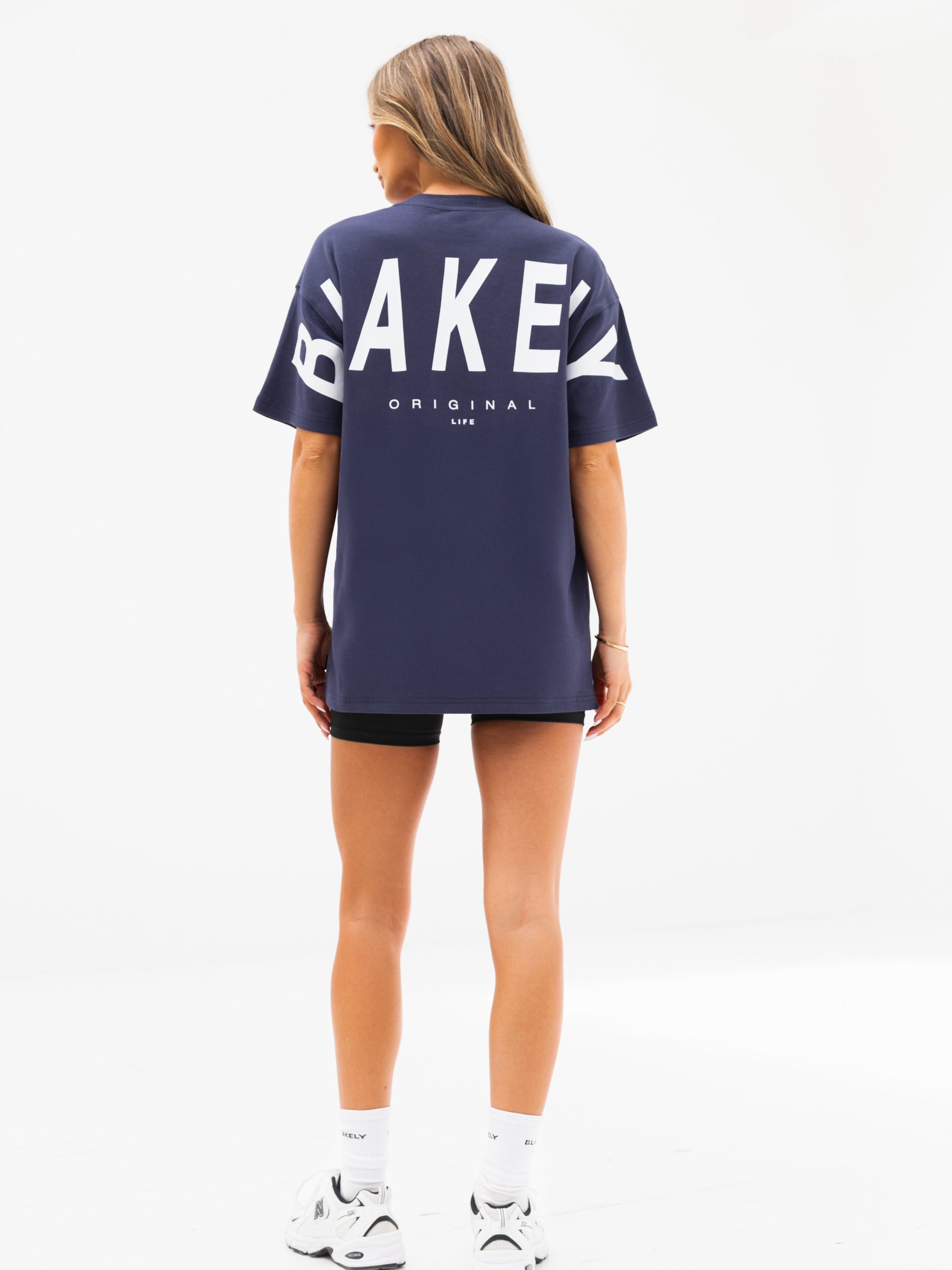 Introducing the Isabel oversized T-shirt in dark navy. This T-shirt is a reimagined version of your favourite Isabel hoodie. It features an oversized silhouette and is crafted from a soft cotton blend for ultimate comfort. The back showcases our signature Blakely branding.