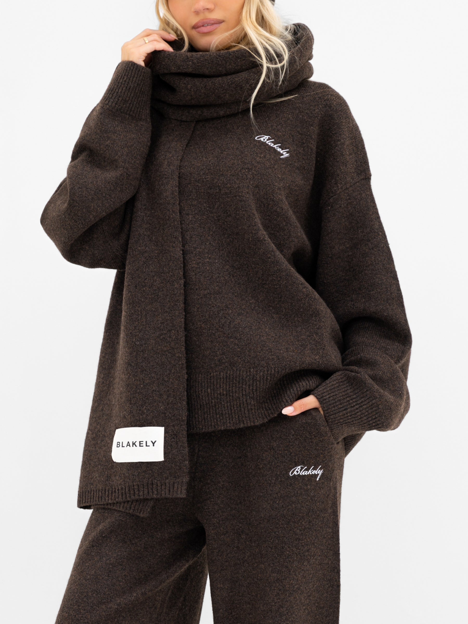 Our collection includes the Knitted Wide-Leg Sweatpants in Chocolate Brown. The sweatpants are made from a soft knitted fabric and have a wide-leg design. They have a relaxed fit and are finished with our Blakely logo on the hip.