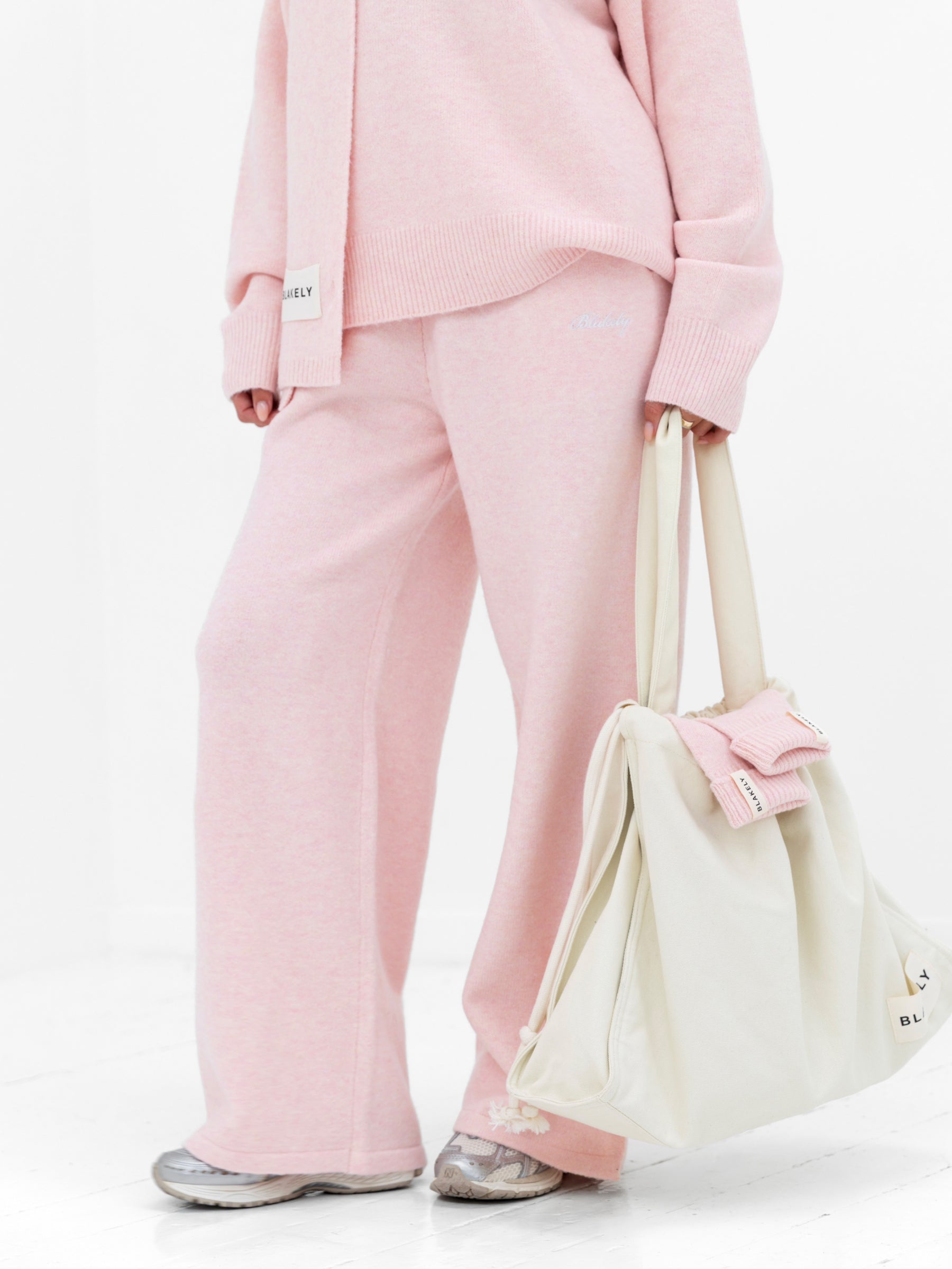 Our collection includes the Knitted Wide-Leg Sweatpants in Marshmallow Pink. The sweatpants are made from a soft knitted fabric and have a wide-leg design. They have a relaxed fit and are finished with our Blakely logo on the hip.