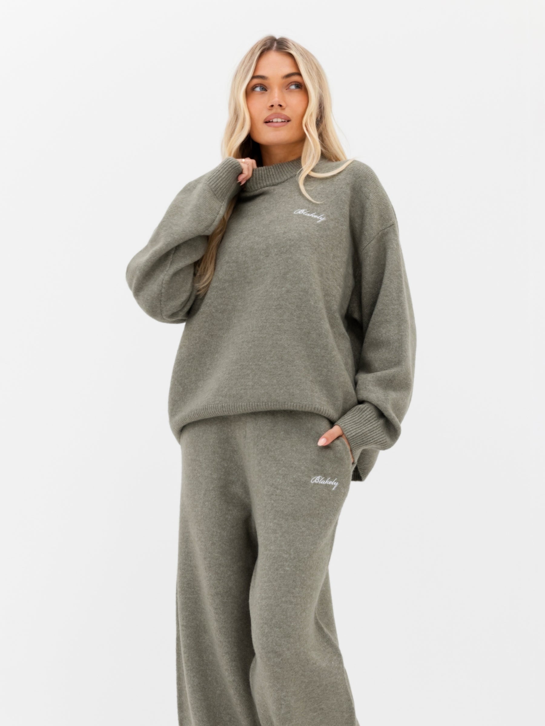 Our collection includes the Knitted Wide-Leg Sweatpants in Safari Green. The sweatpants are made from a soft knitted fabric and have a wide-leg design. They have a relaxed fit and are finished with our Blakely logo on the hip.