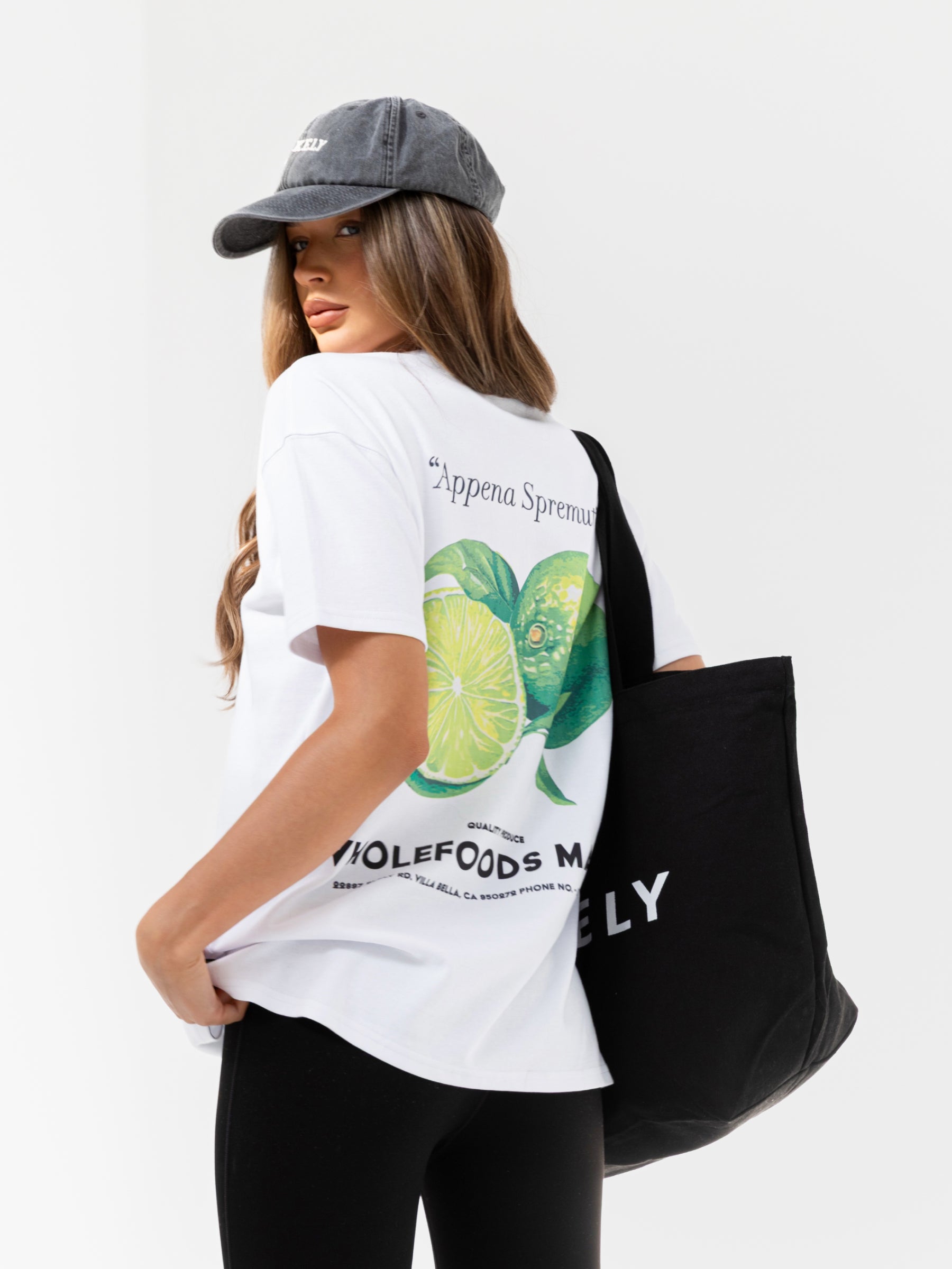 Introducing our Lilo Fruit Tee in White. crafted from a soft cotton blend and designed with an oversized fit for ultimate comfort. This T-shirt features a bold screen-printed fruit graphic on the back and a minimal logo on the front.
