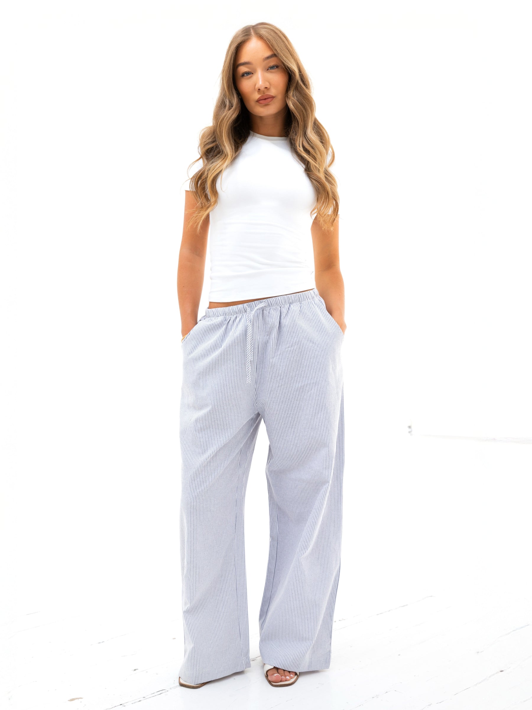 Welcome the warmer weather with our Lola Stripe Trousers in Grey. These trousers feature a relaxed fit and a stripe design. With a contrasting pattern hem and back pockets and a thin elasticated drawstring waistband. they are ideal for summer. Finished with a Blakely tab branding on the back pocket.