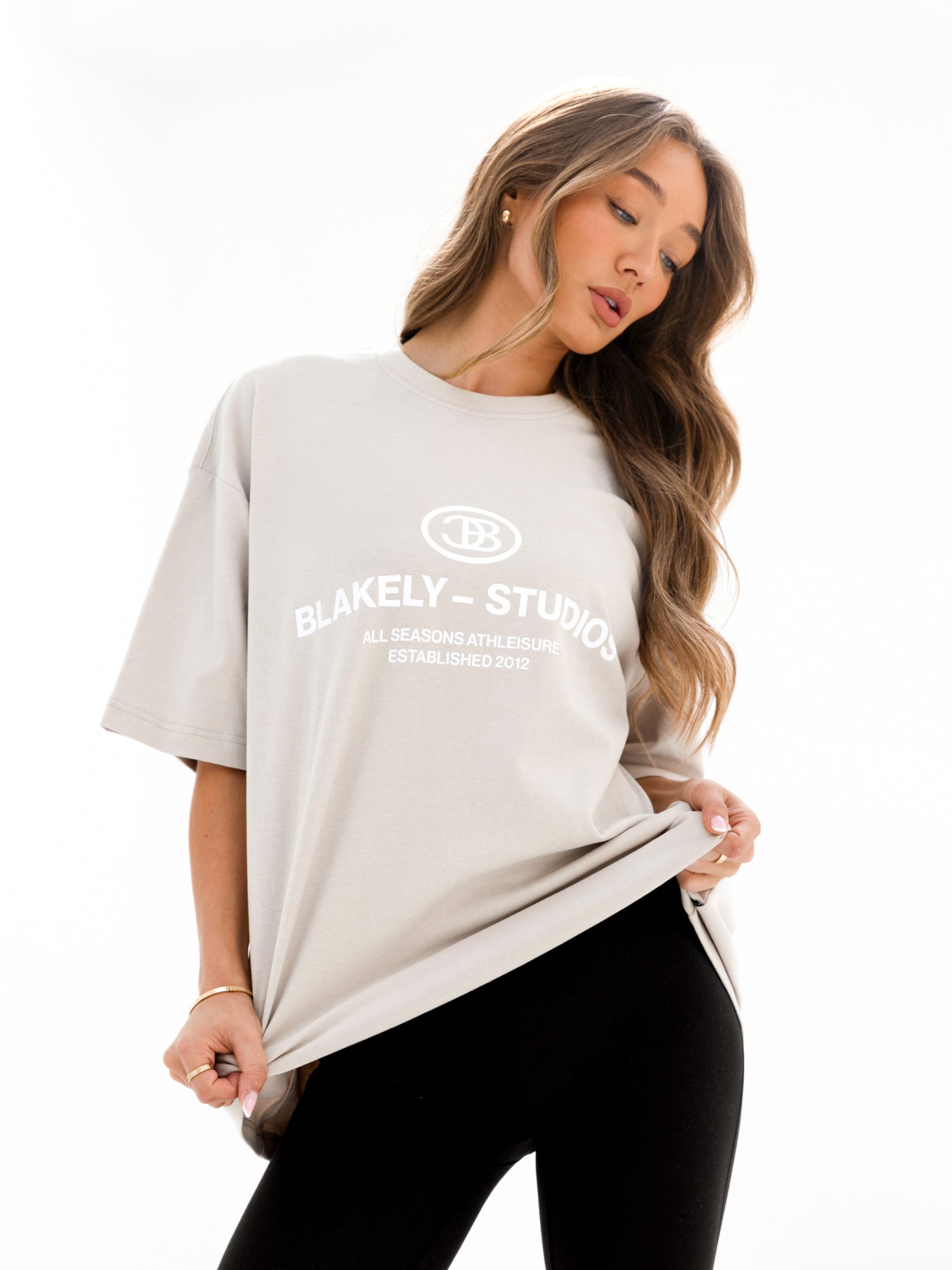 Introducing our Madison Ultra Oversized T-shirt in Dune. crafted from a soft cotton blend and designed with a loose and unfitted shape for ultimate comfort. This T-Shirt features our large screen-printed Initial graphic on the chest.