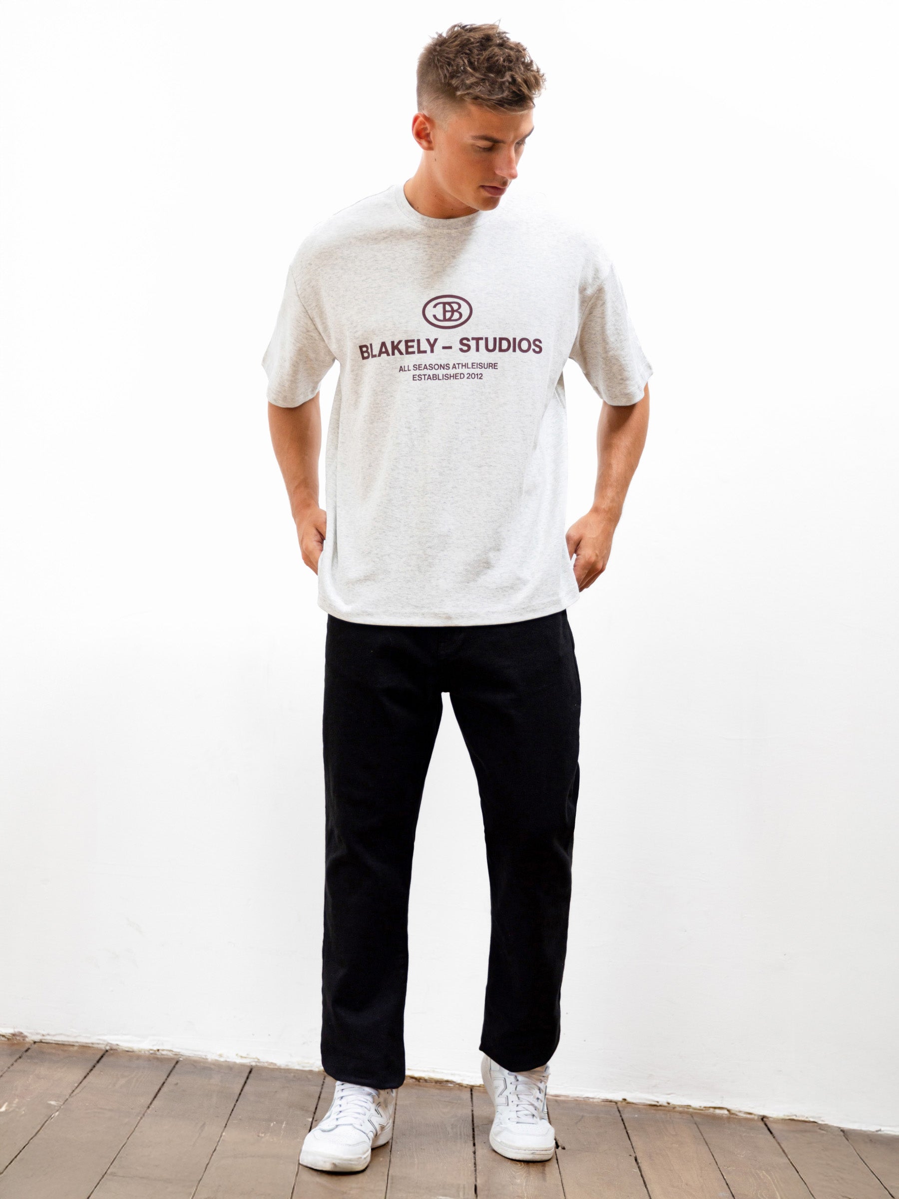 Introducing our Mercer Unfitted T-shirt in Marl White. crafted from a soft cotton blend and designed with a loose and unfitted shape for ultimate comfort. This T-Shirt features our large screen-printed Initial graphic on the chest.