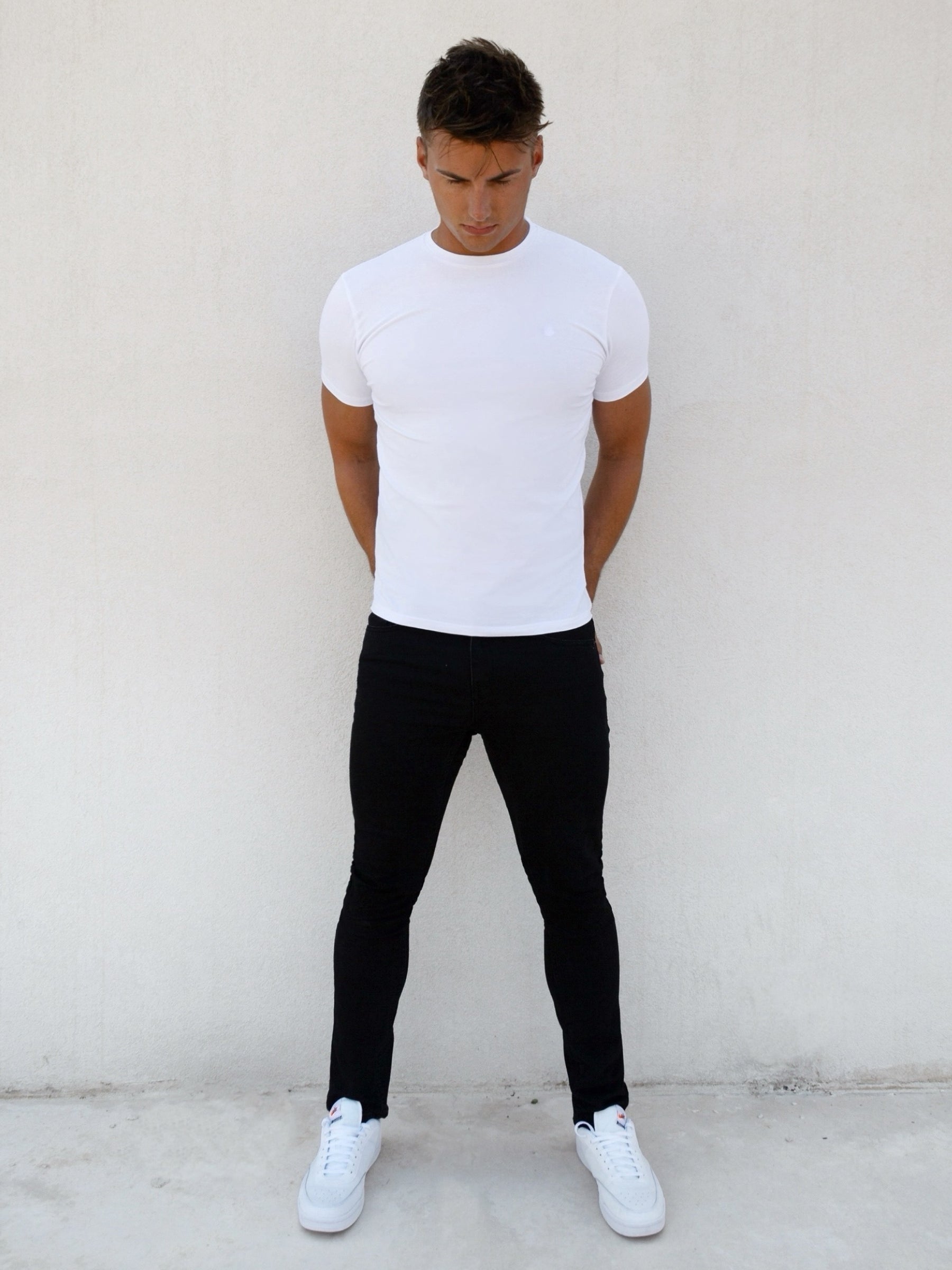 Introducing the Milo T-Shirt in white. a slim-fit t-shirt made from a soft cotton blend. It has short sleeves. a crewneck collar. and is finished with tonal Anchor branding on the chest.