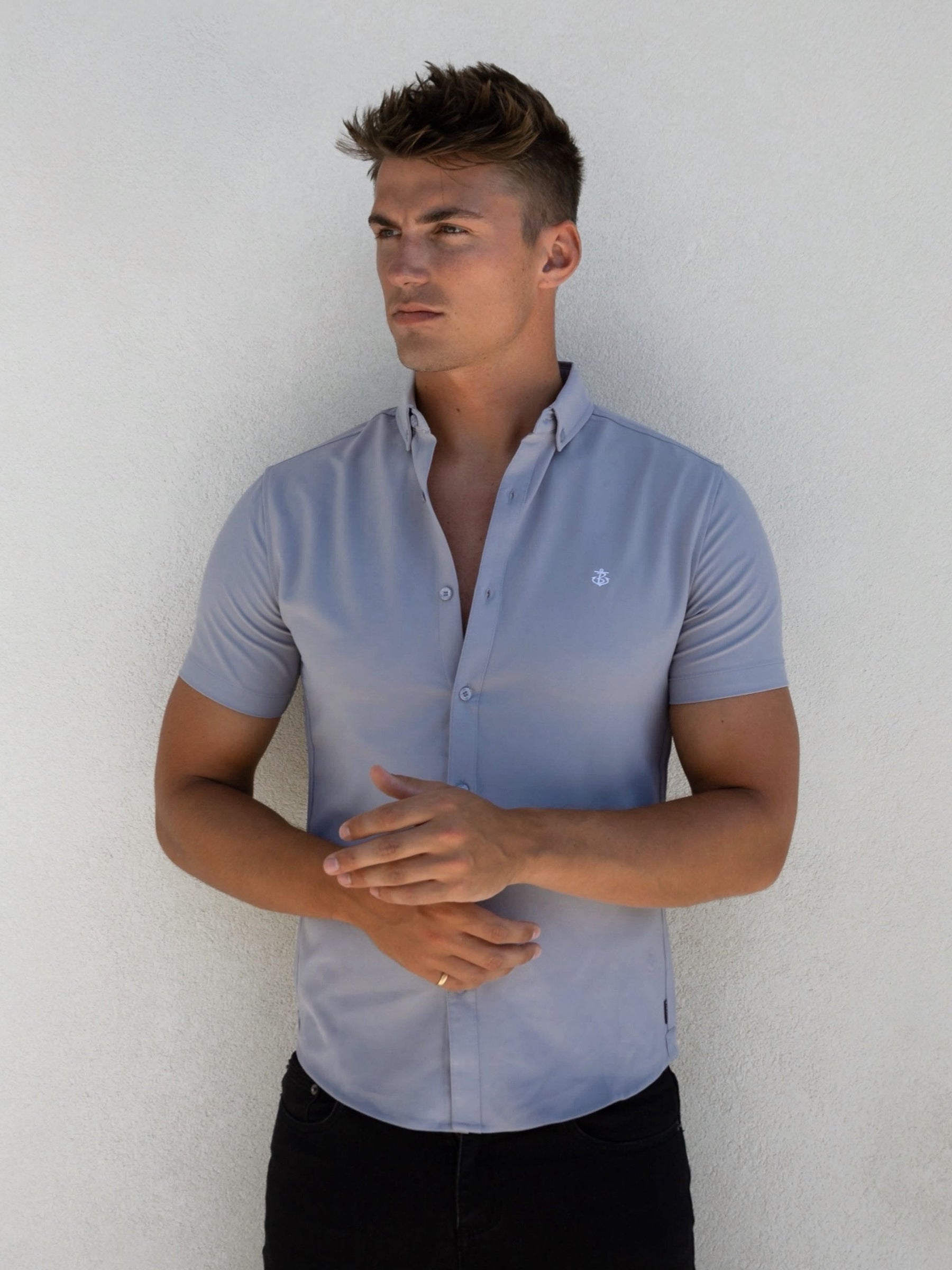 Presenting the Navarra Short Sleeve Shirt in pale lilac. This slim-fit shirt is made with a stretch fabric and features short sleeves. a full button-up collar. and a curved hem. It is finished with an embroidered anchor logo on the left chest.