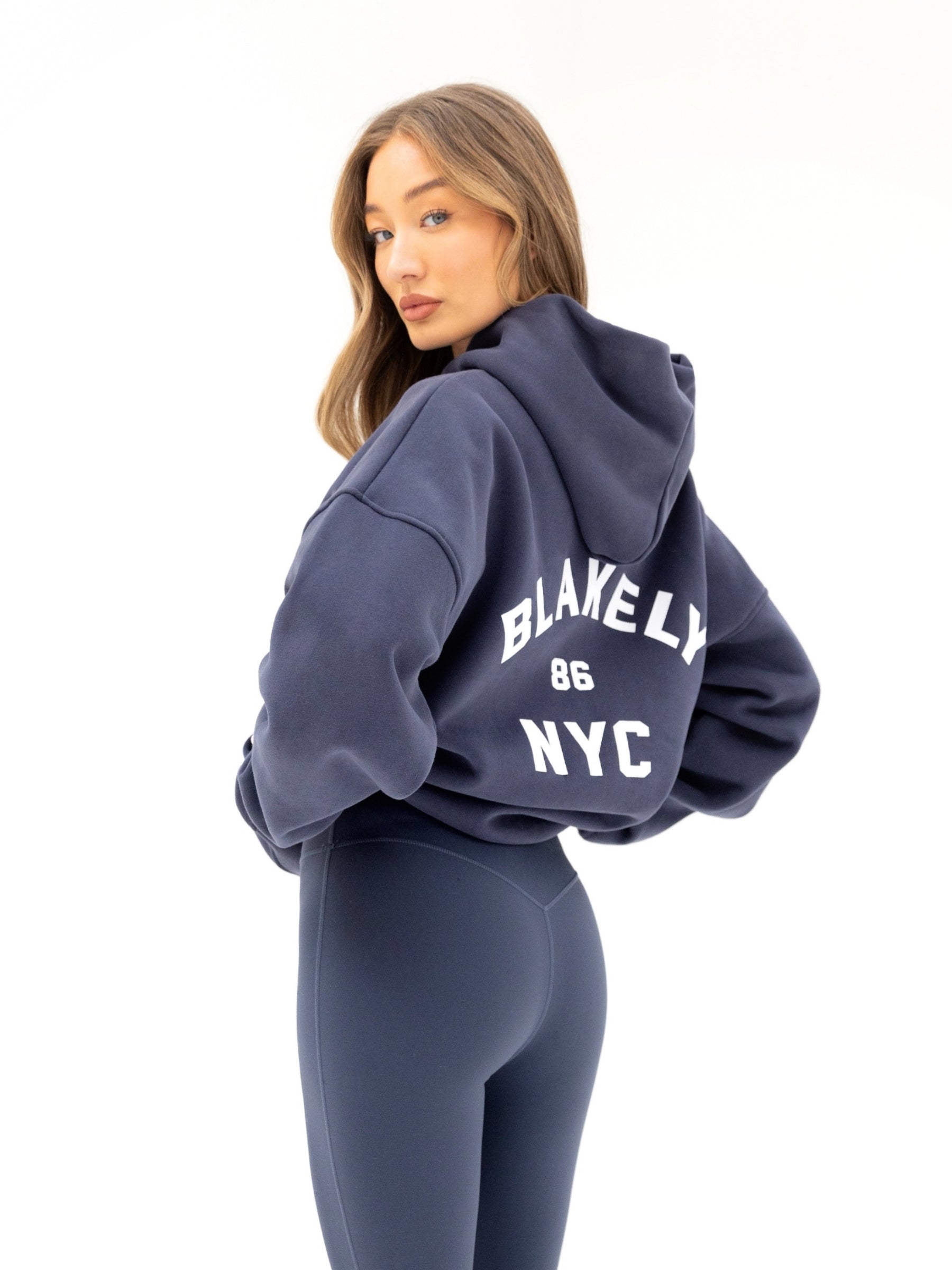 Our True Navy NYC Hoodie features an oversized fit and a roomy front pocket. making it ideal for everyday activities and lounging. It also showcases our NYC 86 Branding. which complements the rest of the collection. creating matching sets.
