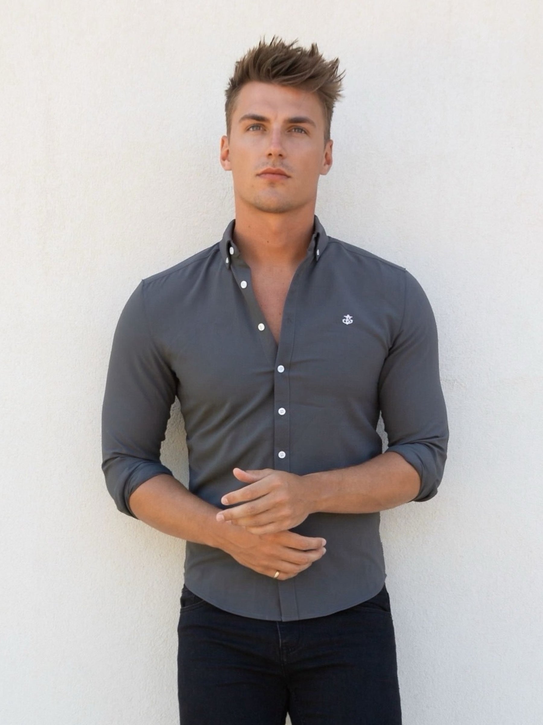 Introducing the Otto Shirt in charcoal. This slim-fit shirt is made with a stretch fabric and features long cuffed sleeves. a full button-up collar. and a curved hem. It is finished with an embroidered anchor logo on the left chest.