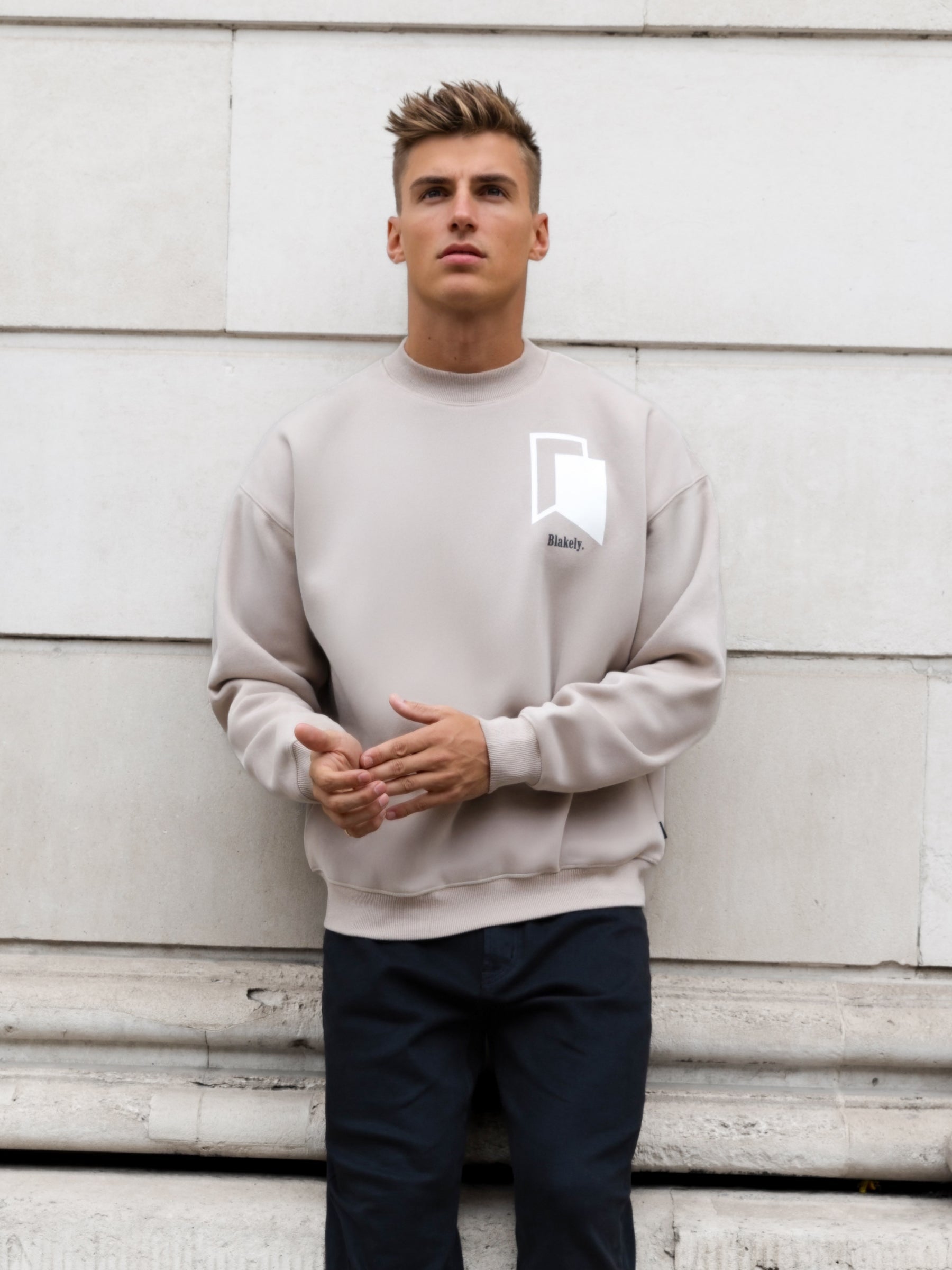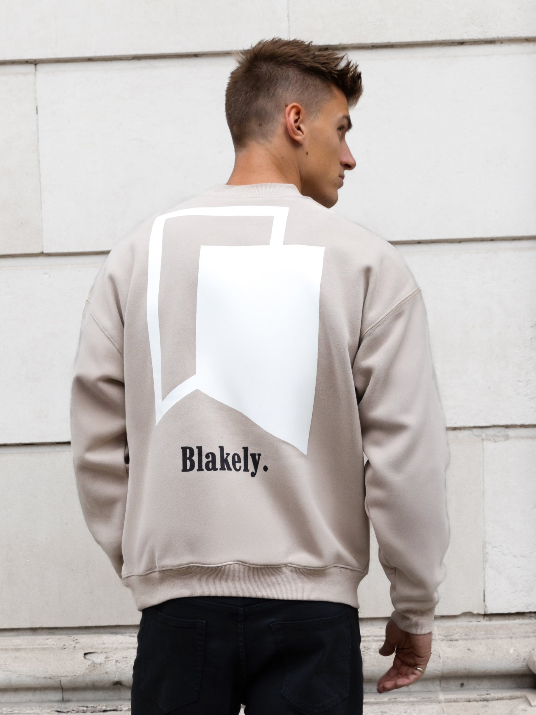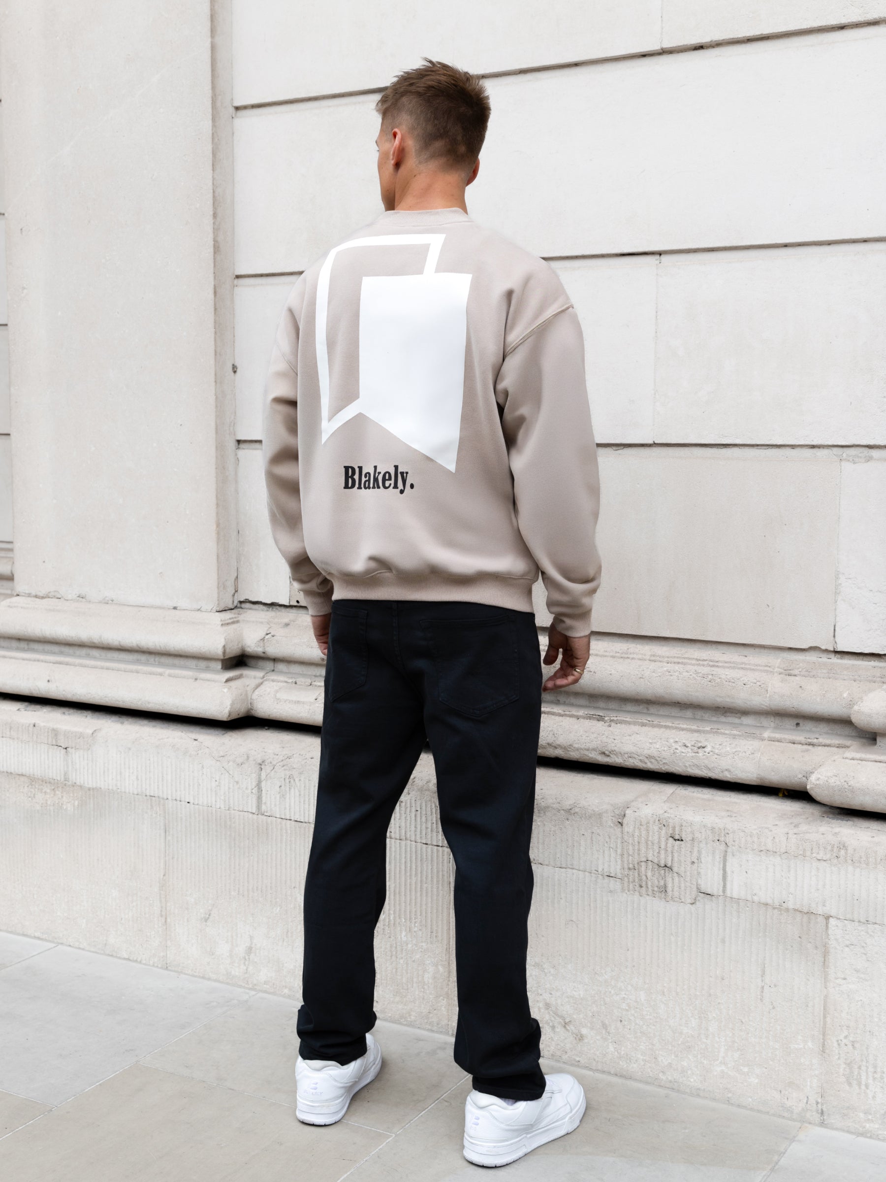 Our Revolve Relaxed Sweater in Tan. Featuring a geometric graphic on the back and front. this design takes a bolder graphic direction. With a loose cut and a soft fabric blend. its inspiration stems from the architectural forms and artworks of Los Angeles.