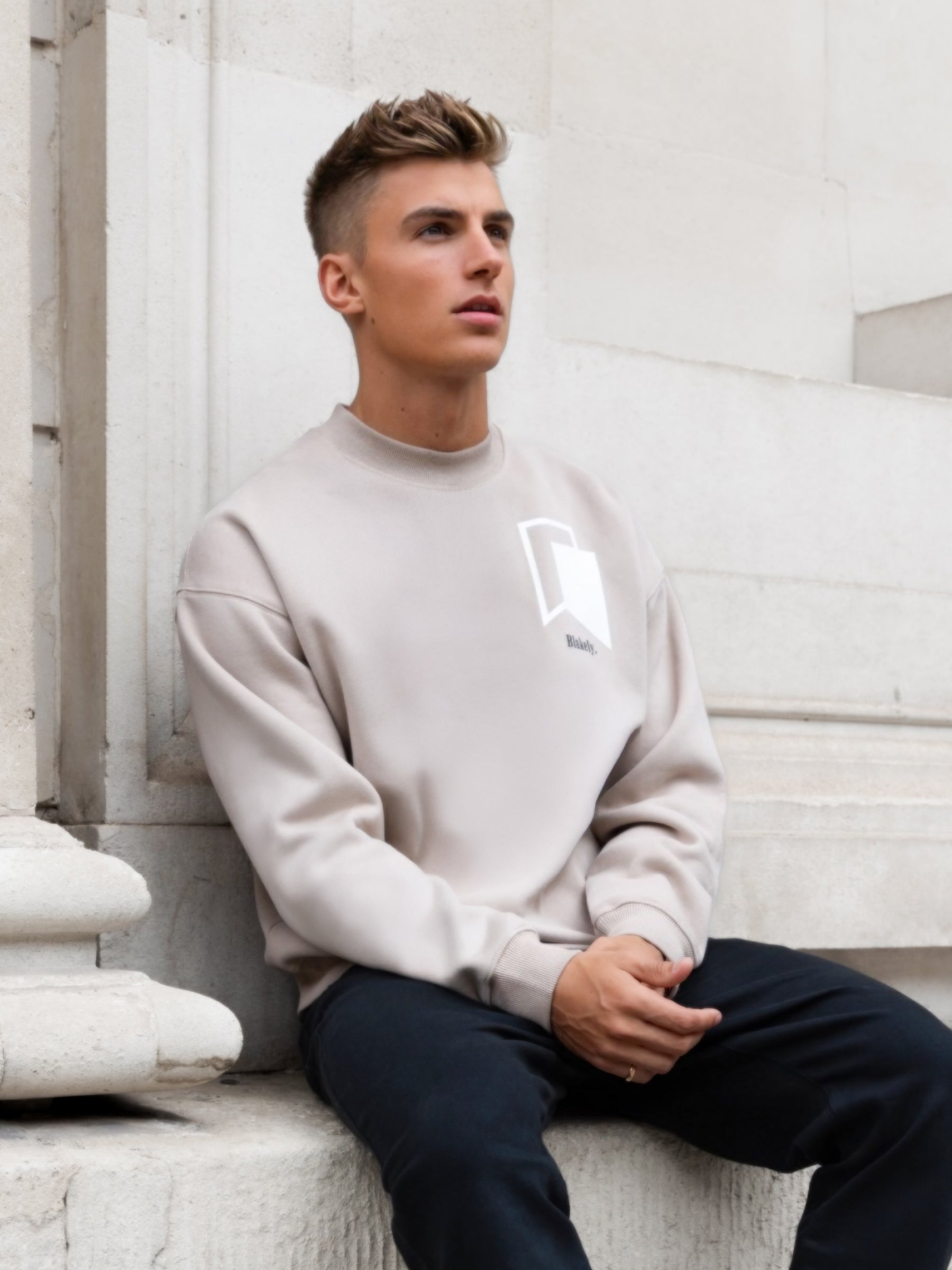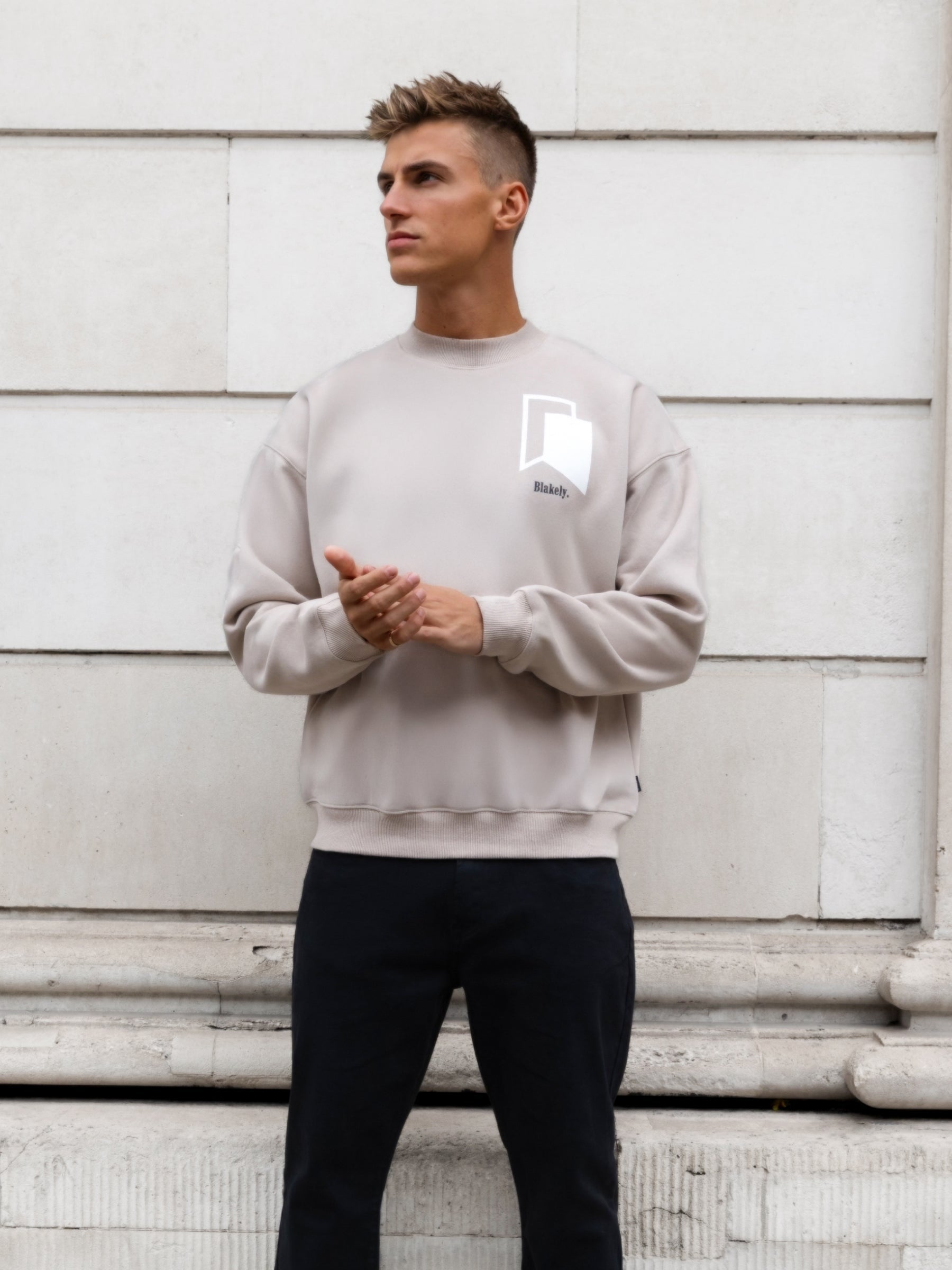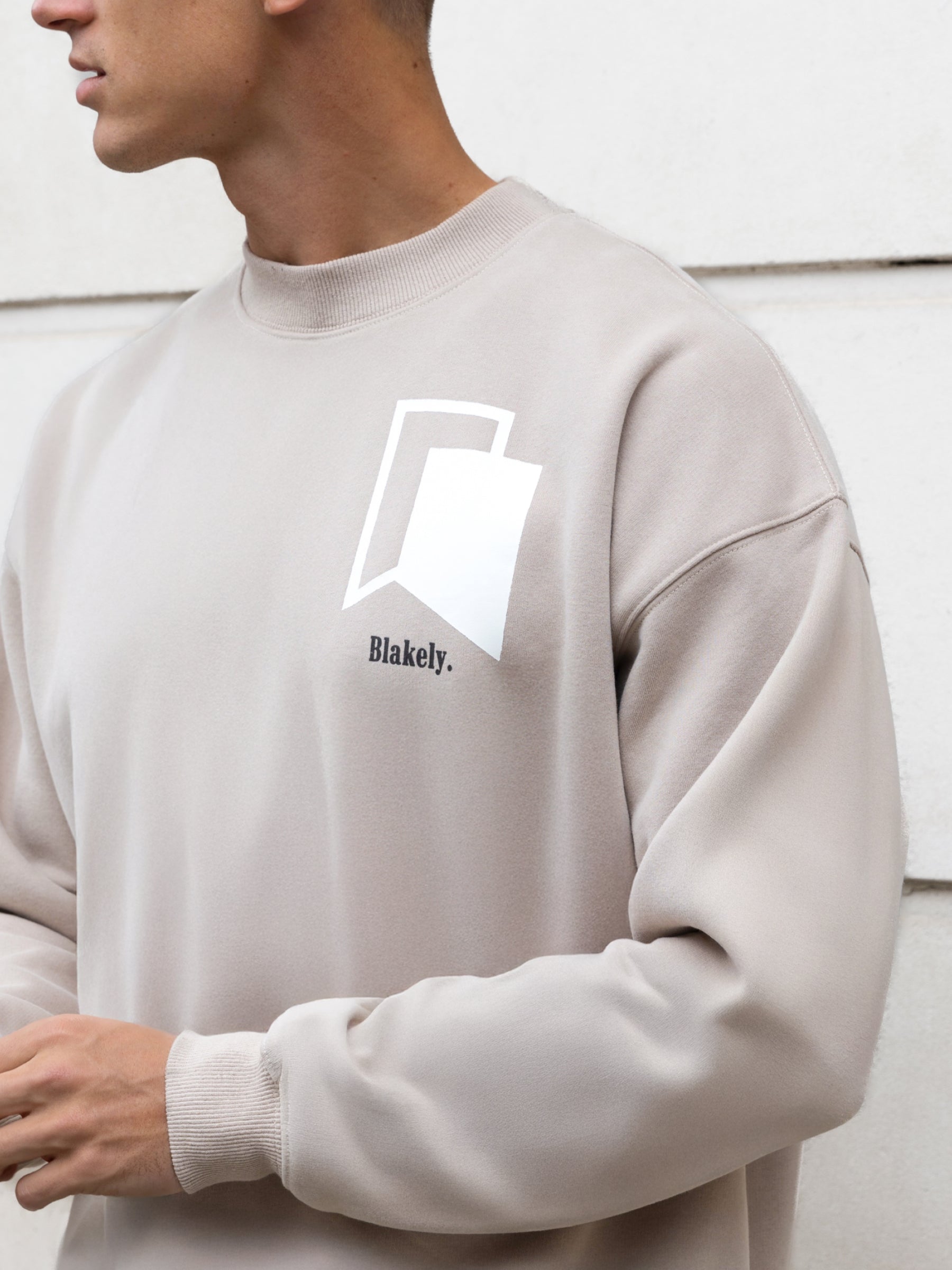 Our Revolve Relaxed Sweater in Tan. Featuring a geometric graphic on the back and front. this design takes a bolder graphic direction. With a loose cut and a soft fabric blend. its inspiration stems from the architectural forms and artworks of Los Angeles.