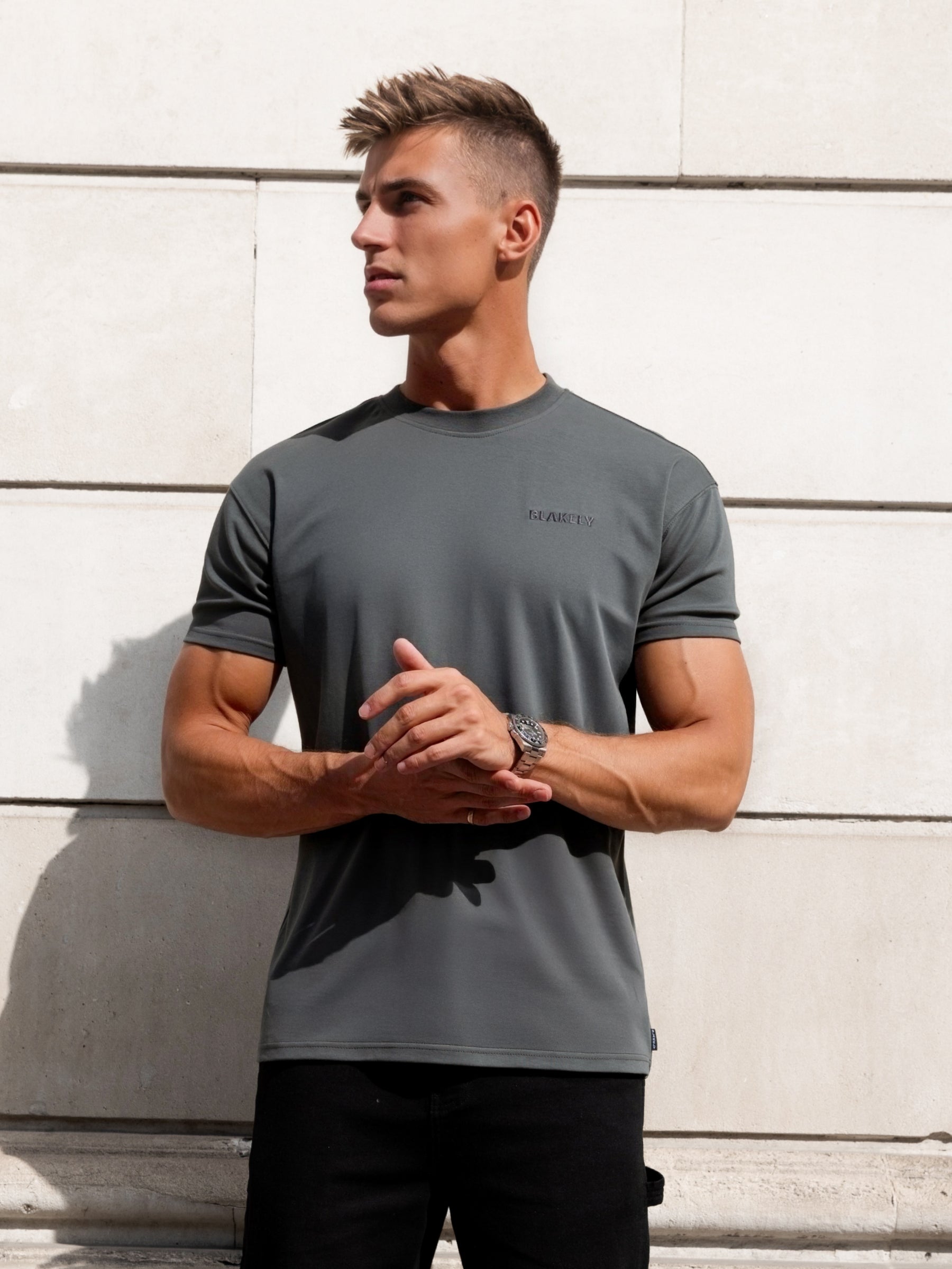Introducing our Rhys T-Shirt in Khaki Grey. crafted from a soft cotton blend and designed with a relaxed fit for comfort. This T-Shirt features our small Blakely logo printed on the front.