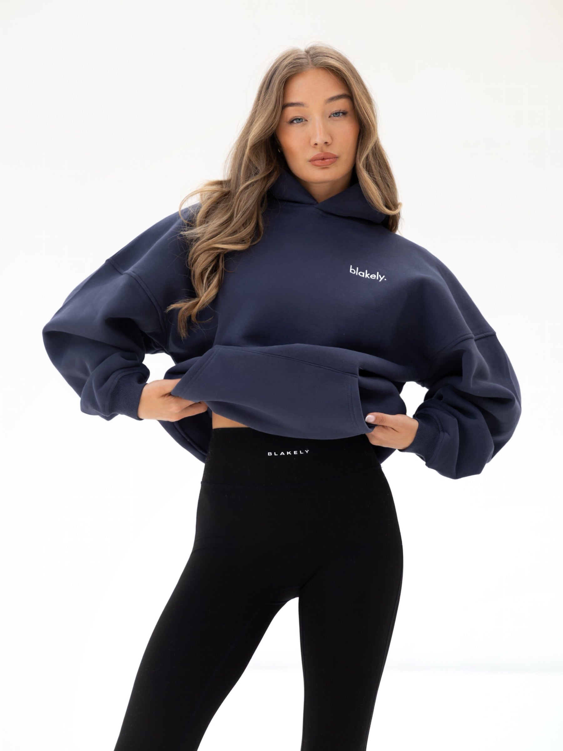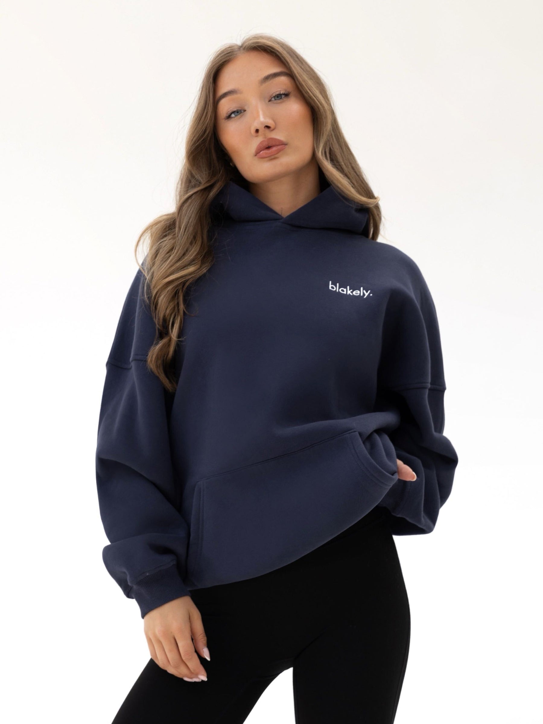 Our Sami Hoodie in True Navy features an oversized fit and a roomy front pocket. making it ideal for everyday activities and lounging. It also showcases a small Blakely logo in a thinner font. which complements the rest of the collection.
