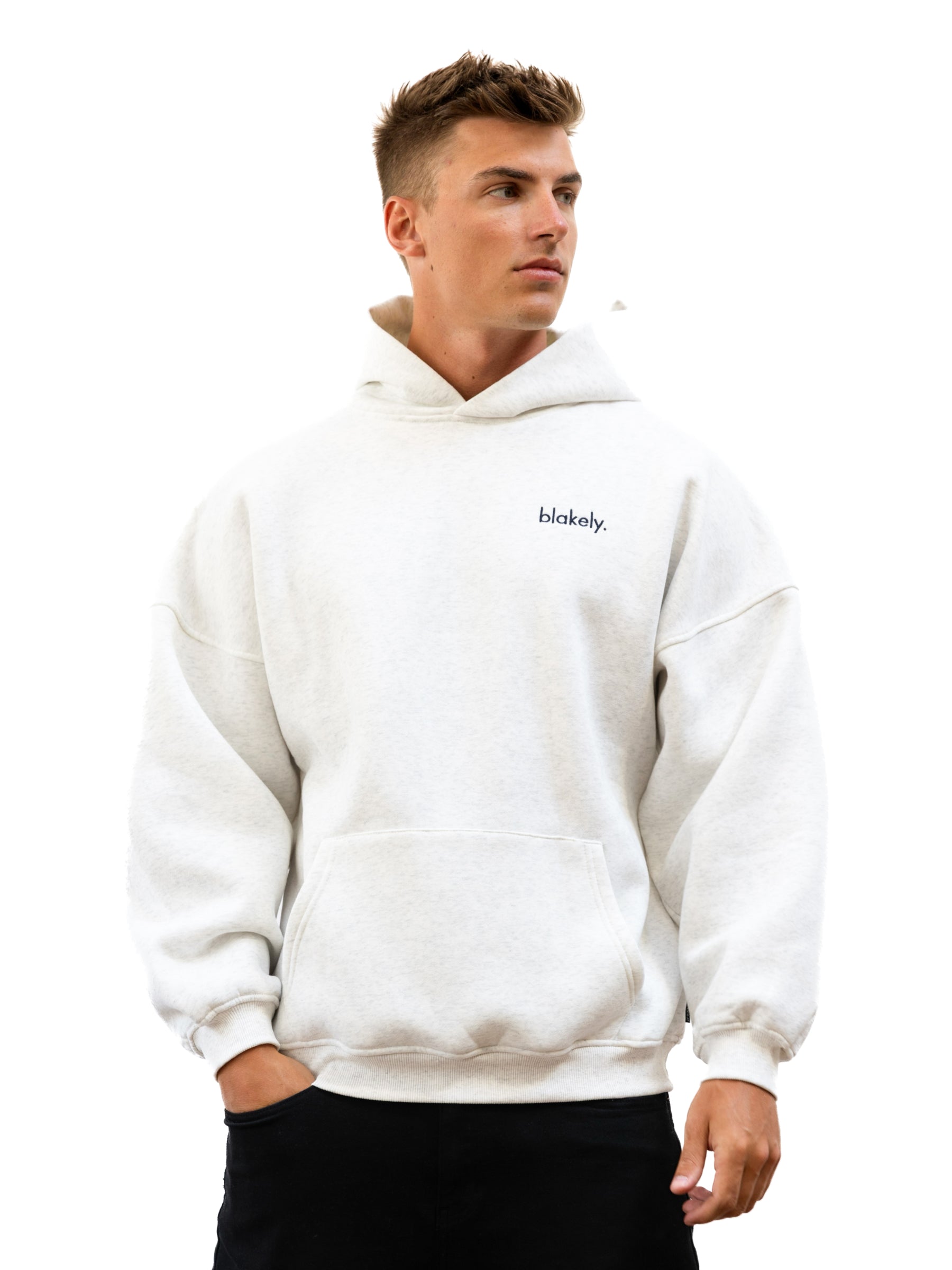 Our Sami Hoodie in Marl White features a relaxed fit and a roomy front pocket. making it ideal for everyday activities and lounging. It also showcases a small Blakely logo in a thinner font. which complements the rest of the collection.