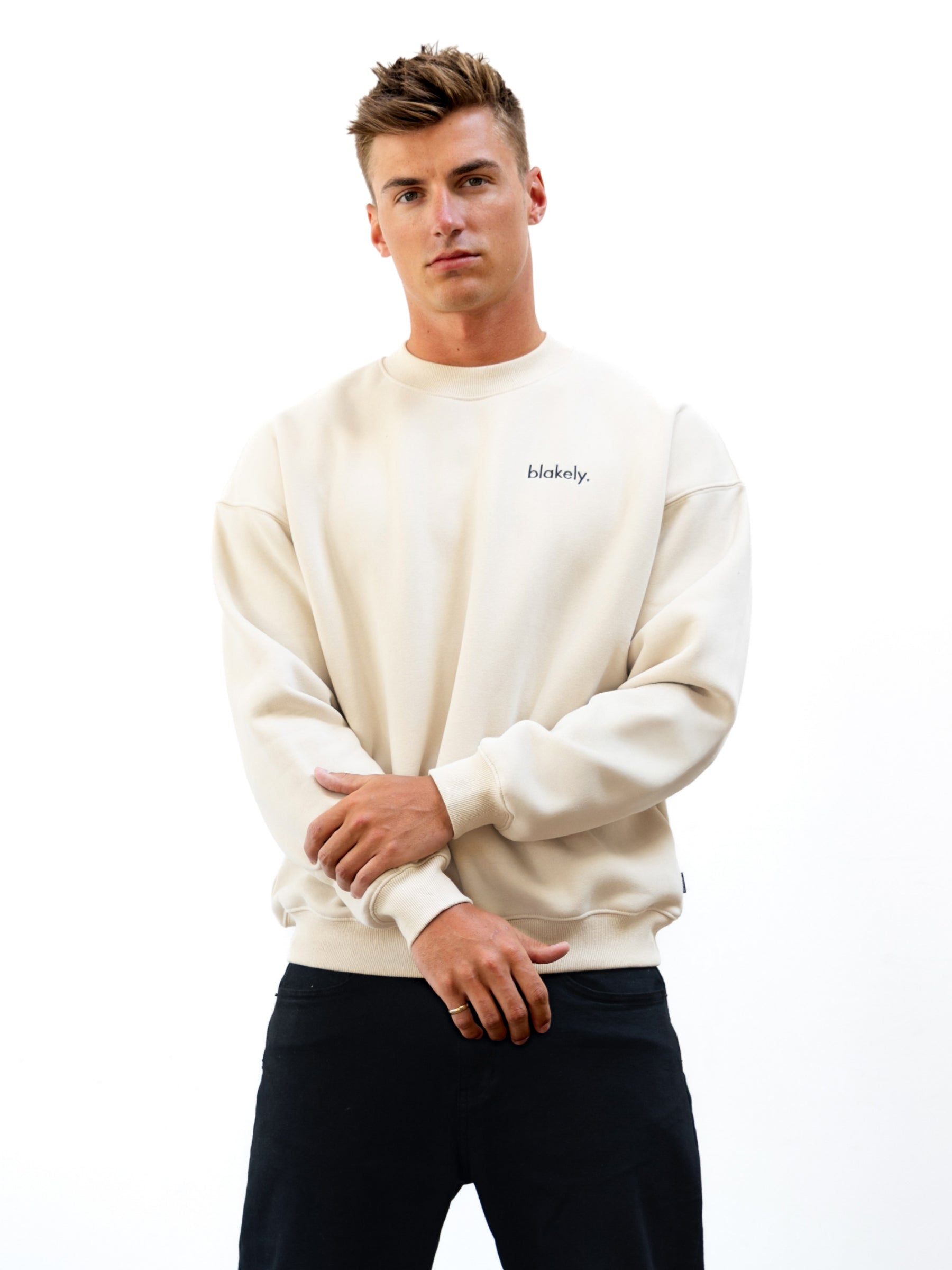 Part of this collection is our Sami Sweater in Bone. This sweater is crafted from a soft cotton blend with a relaxed fit. It has ribbed hems and cuffs and a crew neck design. It has been finished with small Blakely branding on the front.