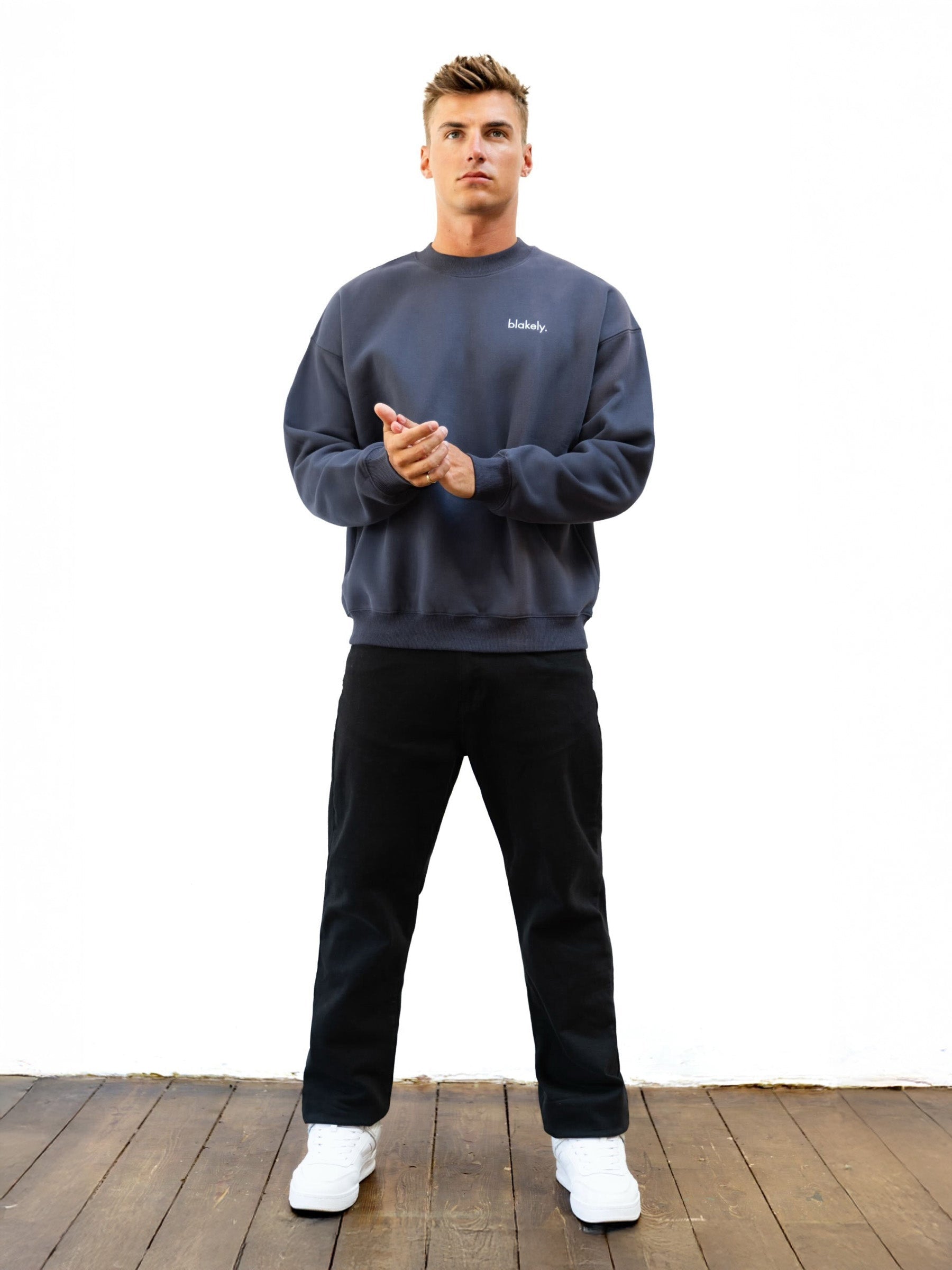 Part of this collection is our Sami Sweater in True Navy. This sweater is crafted from a soft cotton blend with a relaxed fit. It has ribbed hems and cuffs and a crew neck design. It has been finished with small Blakely branding on the front.