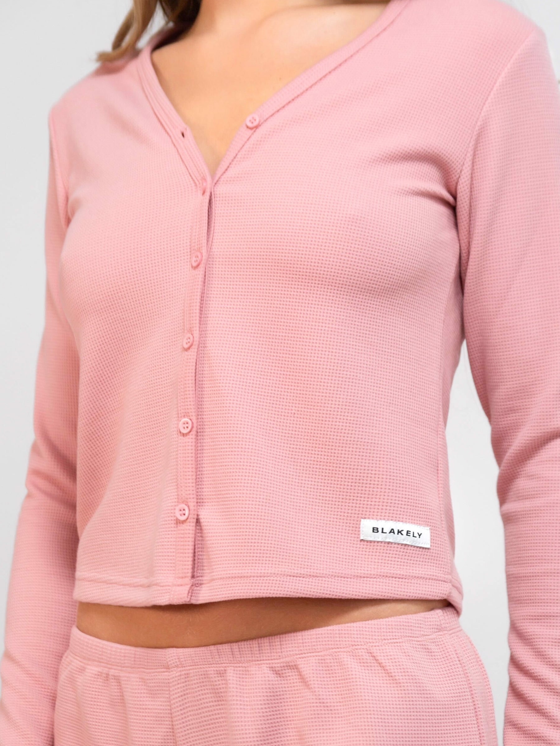 Our Soft Waffle Cardigan in Rose Pink is crafted from a soft waffle knit fabric and features a regular fit. It has a button-up design that leads into a soft V-shaped neckline and is finished with a small Blakey tab. Layer it over our Soft Waffle Vest and pair it with our Soft Waffle Shorts or Trousers for the perfect lounging look.