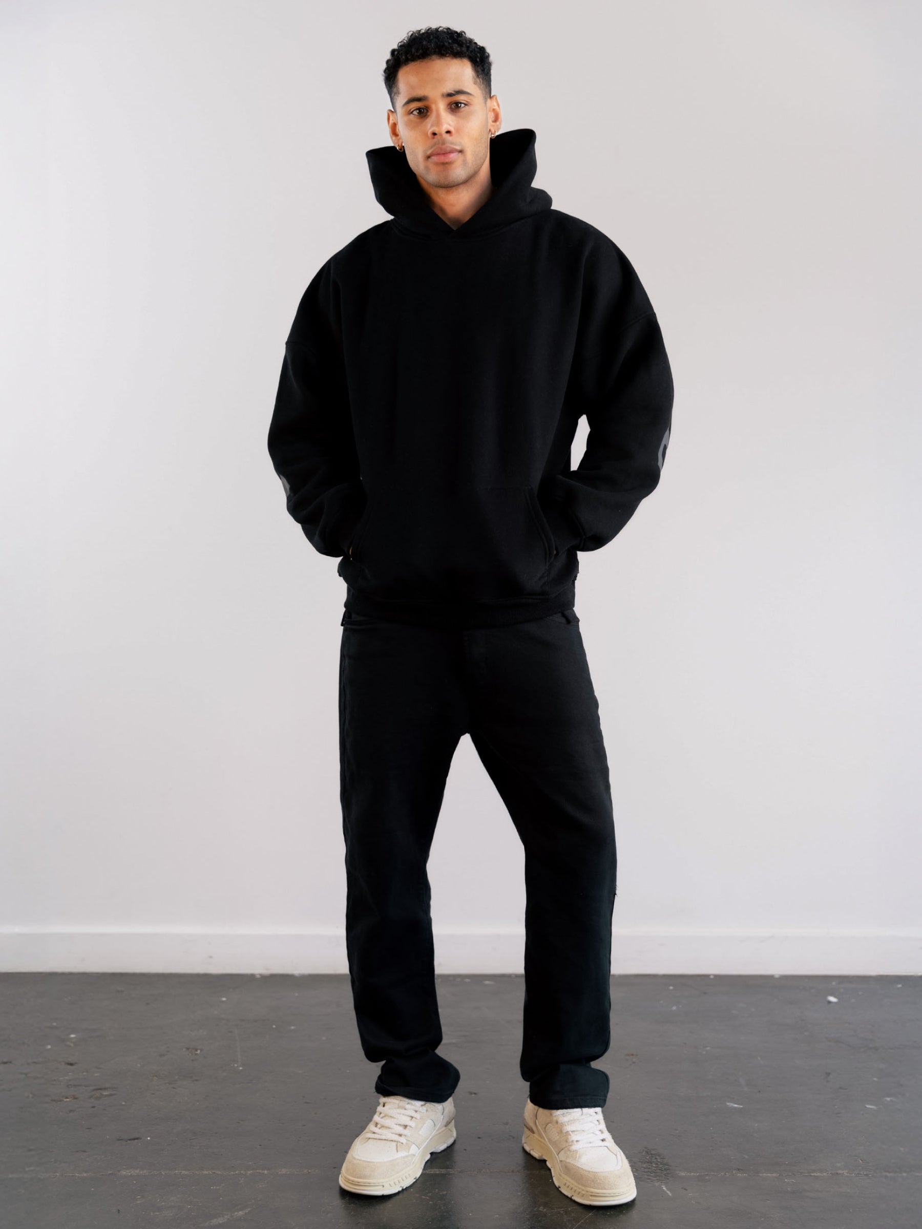 Our best-selling Idris Hoodie is now in a tonal version. Made from a soft cotton blend with an oversized fit. the hoodie features a ribbed hem and cuffs. as well as a large front pocket. It showcases our logo screen printed across the back and arms. offering a clean and bold representation of our brand.