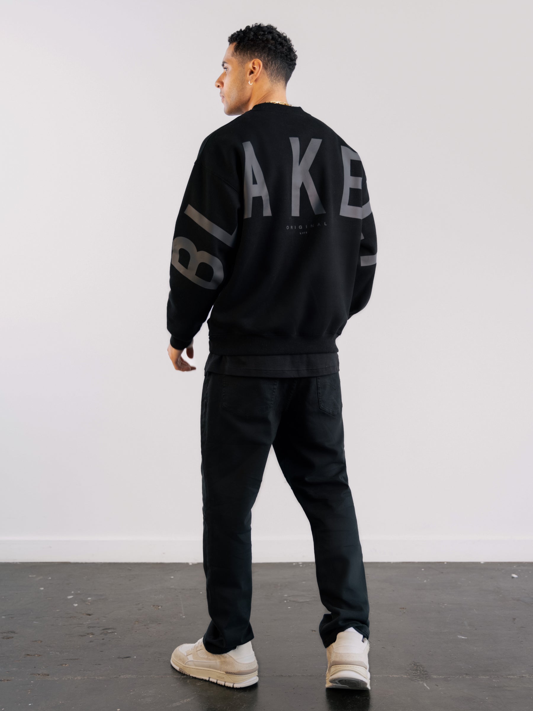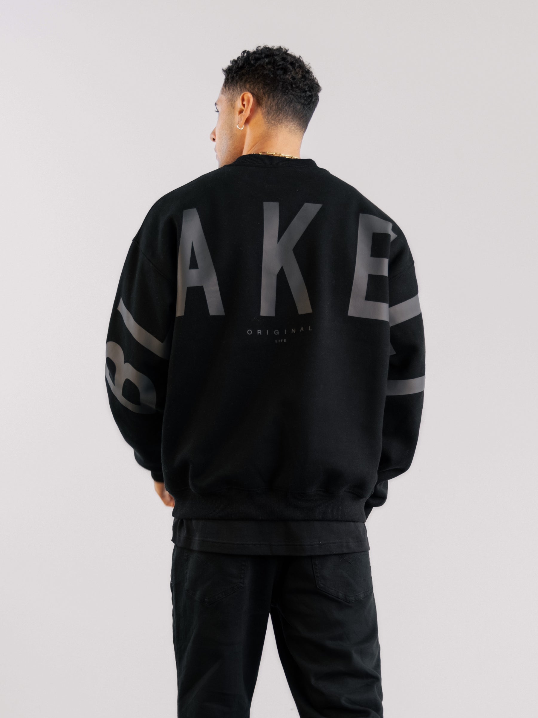 Our best-selling Idris Jumper is now in a tonal version. Made from a soft cotton blend with an oversized fit. the jumper features a ribbed hem and cuffs and a crew-neck design. It showcases our logo screen printed across the back and arms. offering a clean and bold representation of our brand.