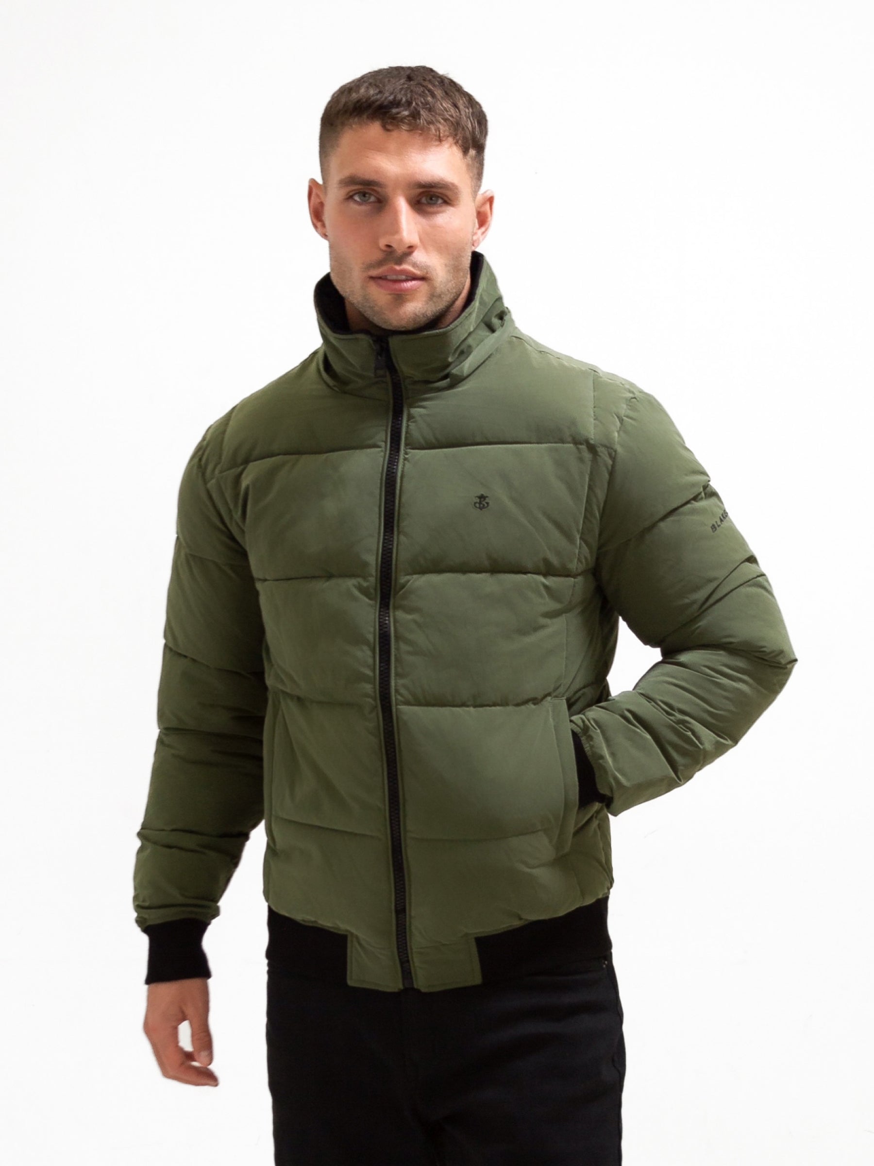 Introducing the Ultimate Puffer Coat in green. an oversized jacket with quilted panels. This puffer jacket features the Blakely Anchor branding on the chest and a raised Blakely logo on the arm. Finishing details include fleece-lined pockets. a full zip closure. and a mock neckline.