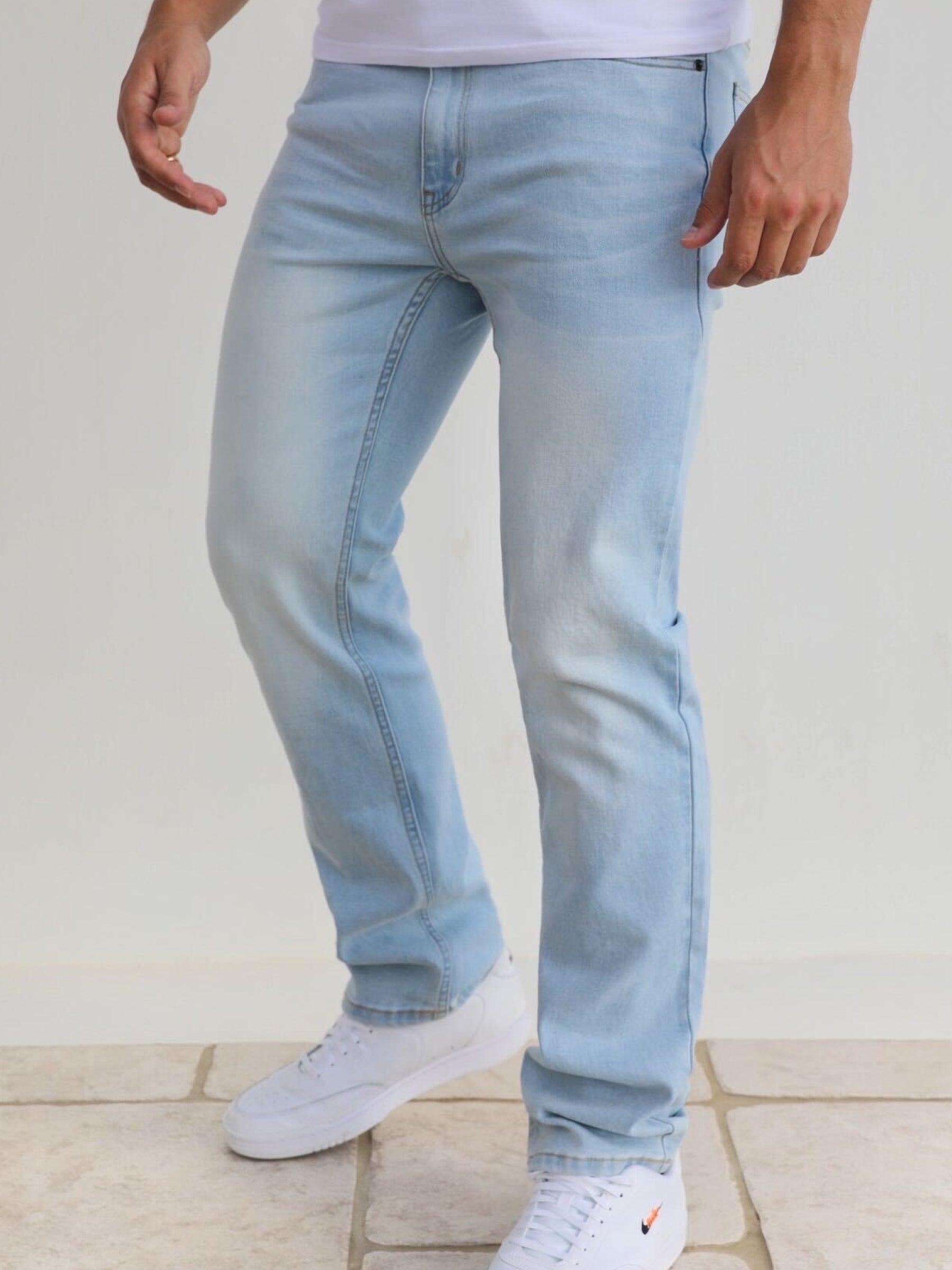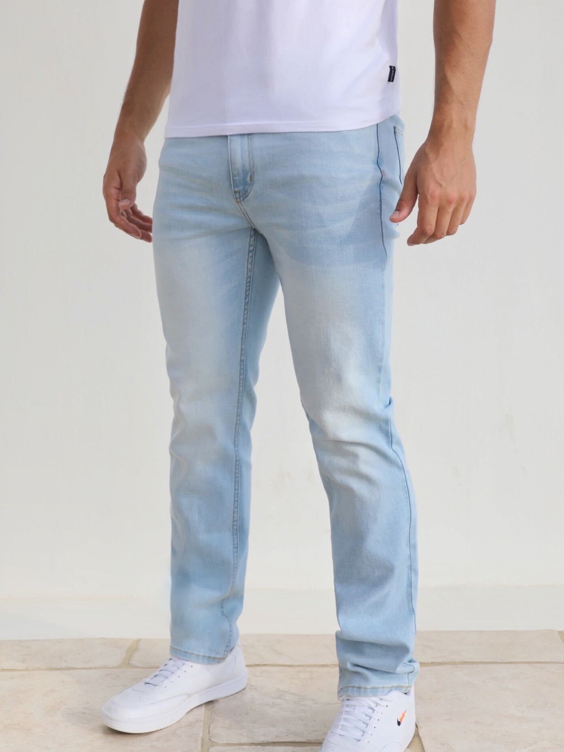 Introducing our Vol.10 Slim Jean in light blue. These jeans feature a slim fit. a stretchy cotton blend. and come in both regular and a shorter leg length. They are designed with side and rear pockets. and are finished with a branded badge. Pair these jeans with one of our slim fit tees for a complete look.